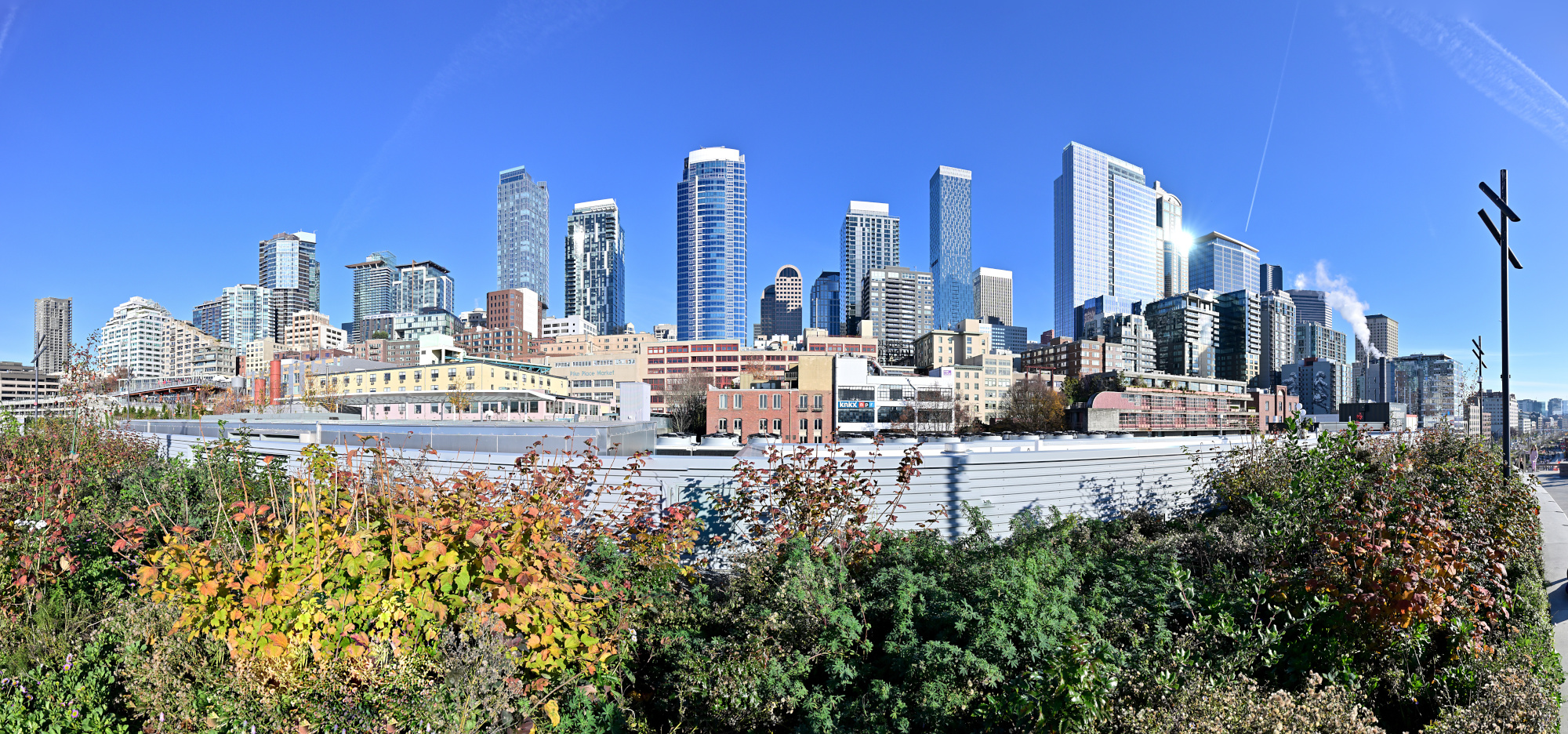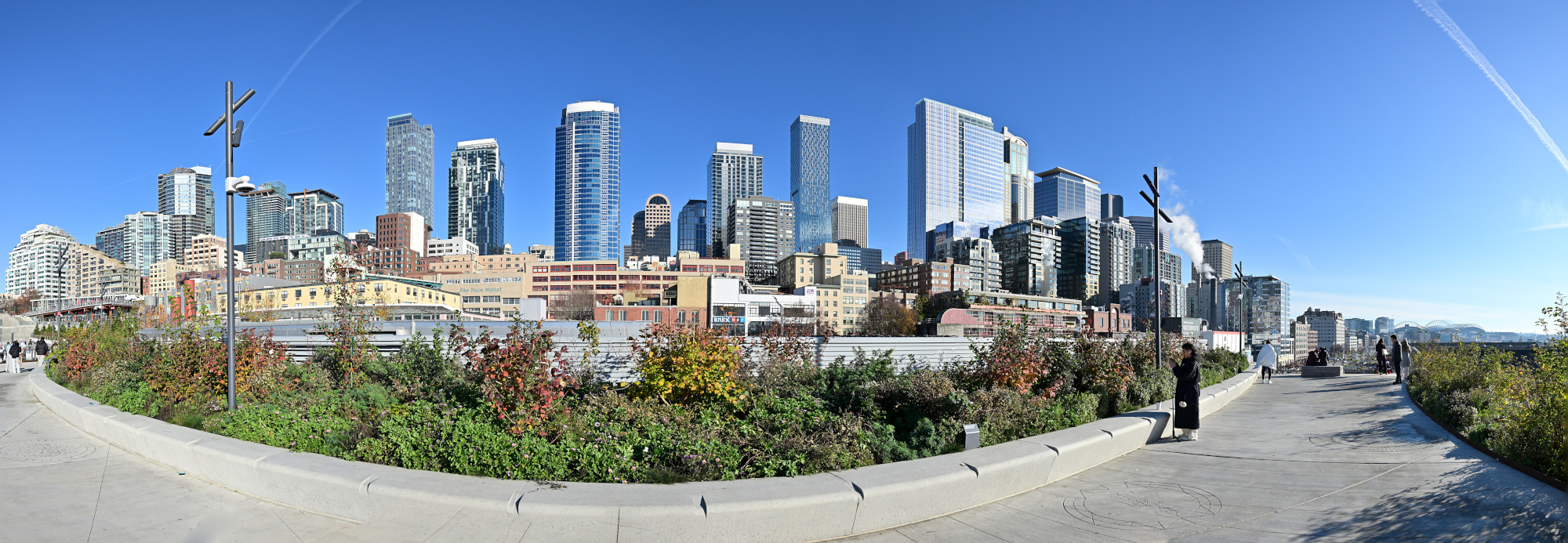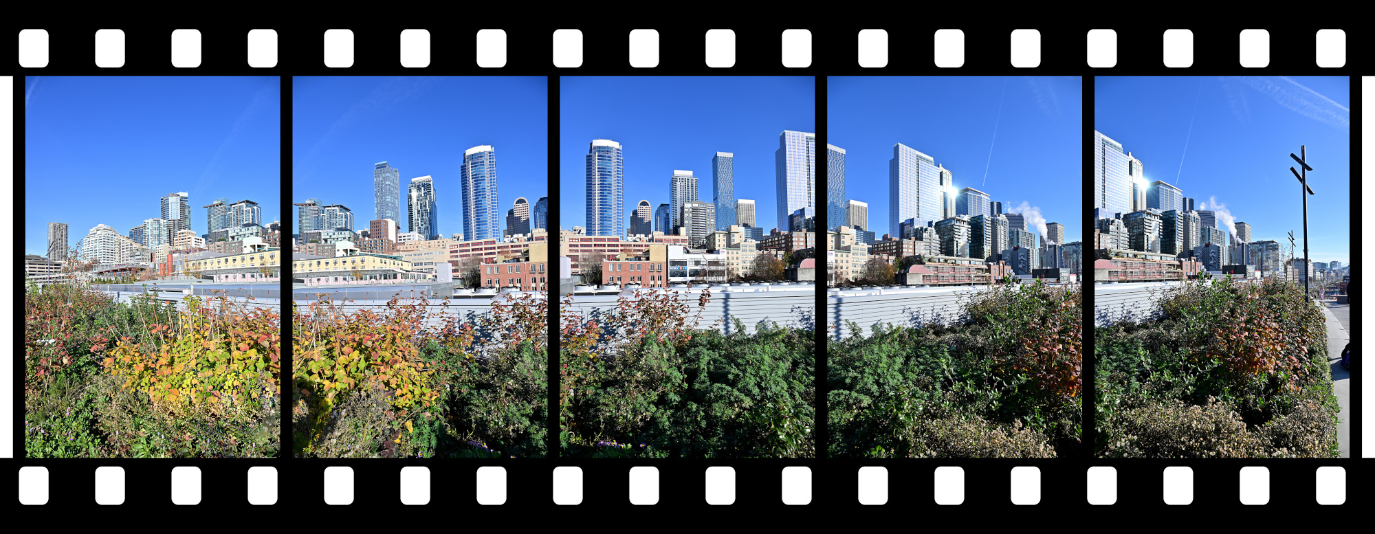 From the Overlook Walk, the view opened wide. The waterfront stretched below, ferries tracing slow lines across the bay, and behind it all the skyline stood still against the pale sky. The skyline panorama frames capture the city in one continuous sweep, holding its full breadth in a single image.