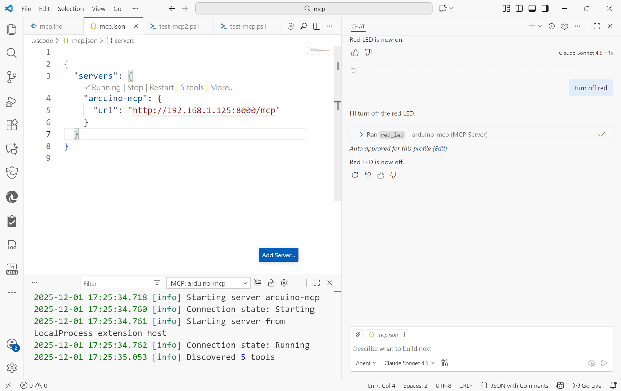 This project brings together two cutting-edge technologies: the Model Context Protocol (MCP) and Arduino Microcontroller. The result is an MCP server running directly on an Arduino Nano ESP32, allowing AI assistants control physical hardware in real-time.