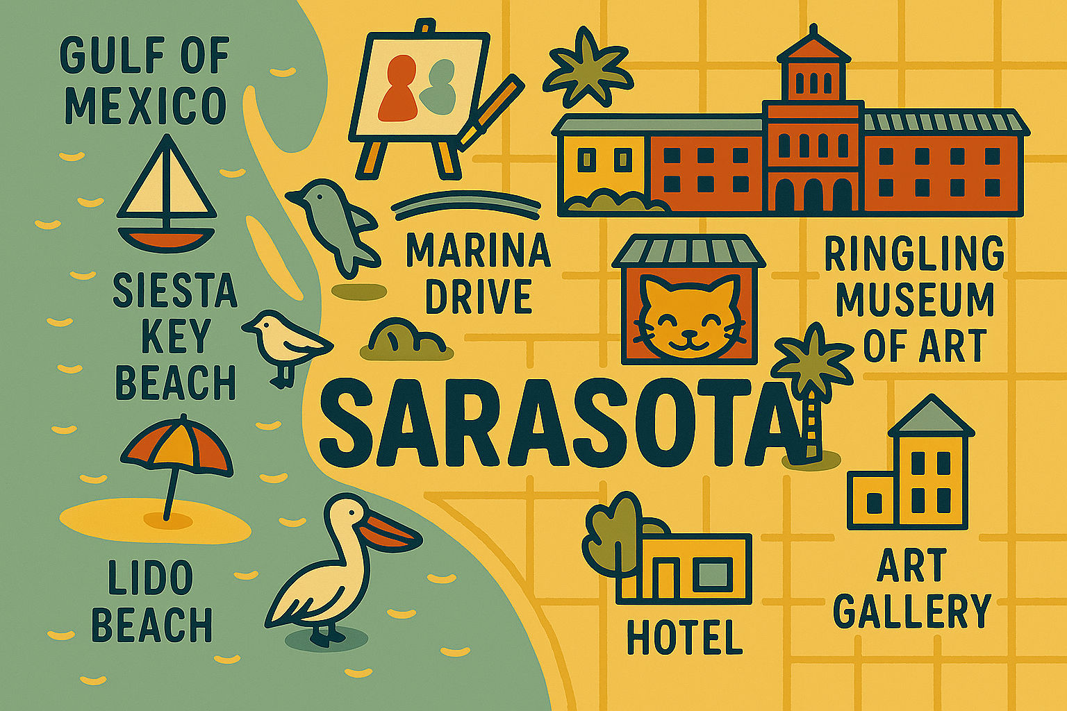 Sarasota is a coastal city in Southwest Florida on the Gulf of Mexico. The horizon opens to the west, the afternoon light settles low across the water, and shallow tides draw long arcs along the coast. North is the Tampa Bay area, while to the south the beaches open into clear water and soft light.