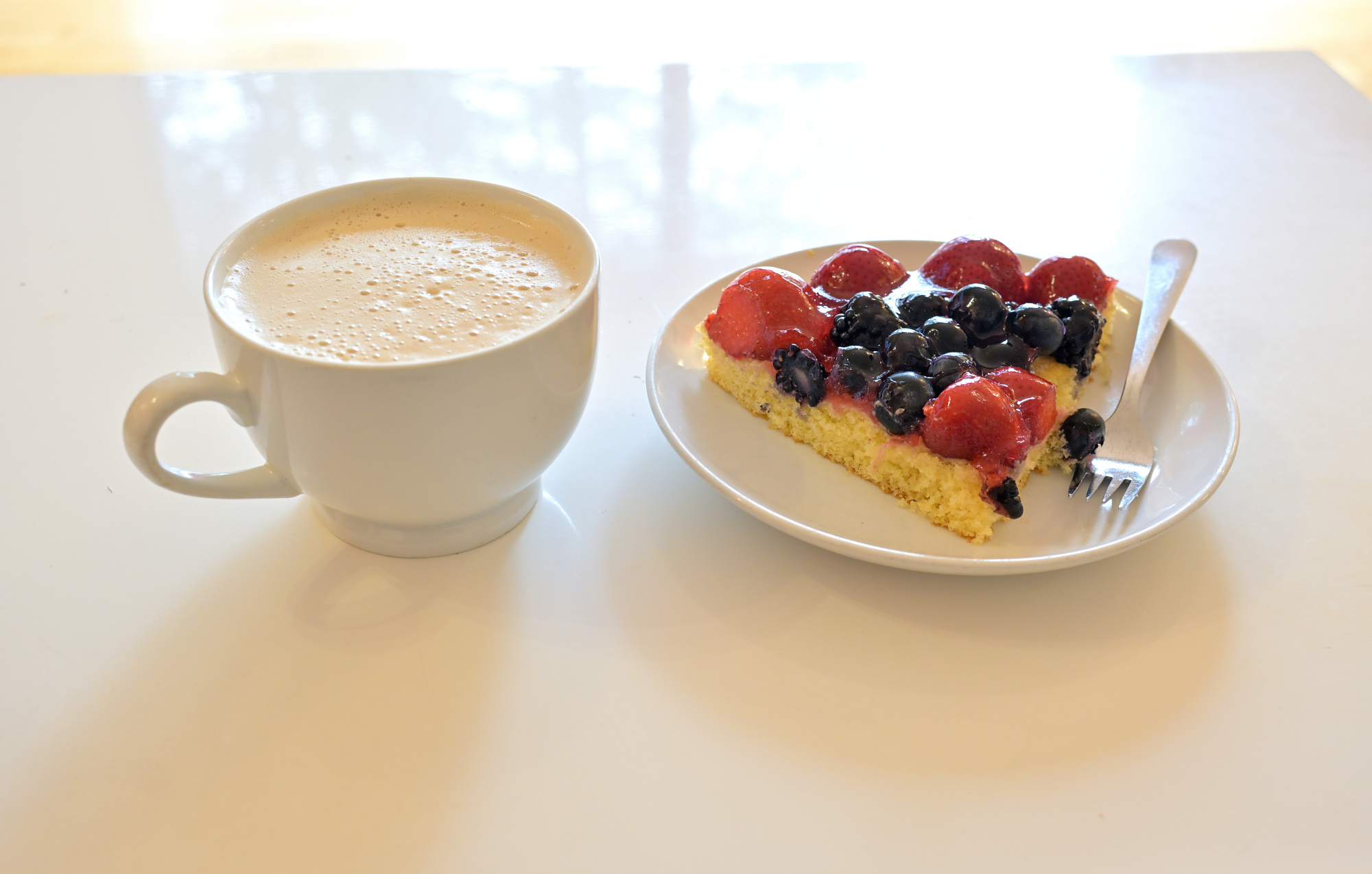 Sonntagskaffee und ein Obstkuchen mit Erdbeeren, Brombeeren und Blaubeeren.