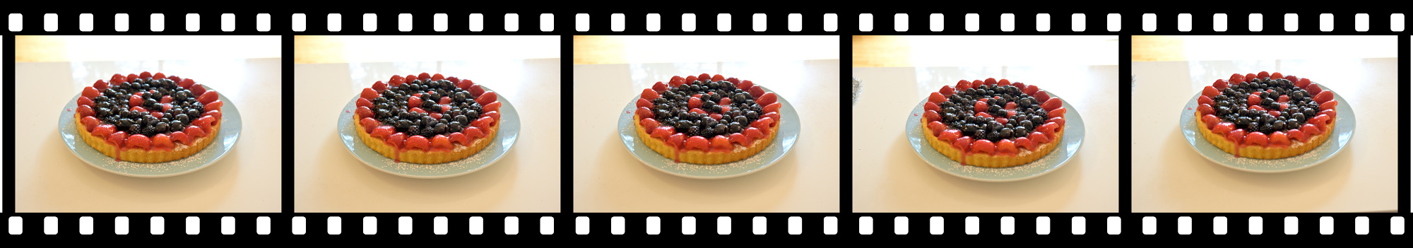 Damit die Details von vorne bis hinten scharf sind, habe ich das Kuchenfoto als Fokus-Stack aufgenommen. Dafür habe ich fünf Aufnahmen gemacht, jeweils mit einem anderen Fokuspunkt, also unterschiedlichen Schärfeebenen. So lässt sich die Schärfe gezielt über das Motiv verteilen, ohne dass man die Blende extrem schließen muss oder unnötig lange Belichtungszeiten riskiert.