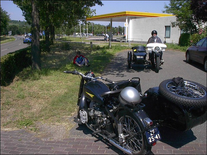 Nino Carboni just arrived on his solo - which is in fact a sidecar outfit, but temporarily relieved of its sidecar burden. On Sunday, Gé Joling was desperately seeking.... fuel! And finally found one of the few gas stations in our hills, running on his last drops of gas. | ||||