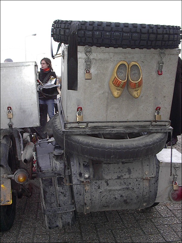 "And because of the Dutch nature of this expedition from Shanghai to the Netherlands, what else to bolt onto the sidecar then a pair of Dutch klompen (aka wooden shoes). In Romania people threw in their coins!" | ||||