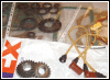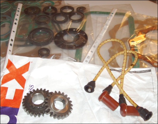 Here are some of the smaller itemsgaskets, gears etc. In the foreground are fourth gear upgrade parts that will give the bike more top end. There's also one of my favorite CJ itemsa set of plug wires with fabric insulation and bakelite terminals. And of course there's a bunch of assorted seals, gaskets, etc. Happy day. | ||||