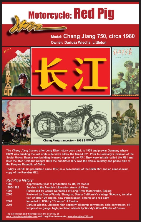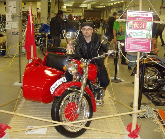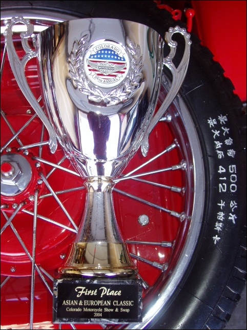 The Red Pig took first place in the Asian/European Classic Division at the 26th. Annual Colorado Motorcycle Show and Swap. Dariusz's friend Wan-Chen Tsai executed Red Pig in both simplified and traditional Chinese characters. | |