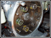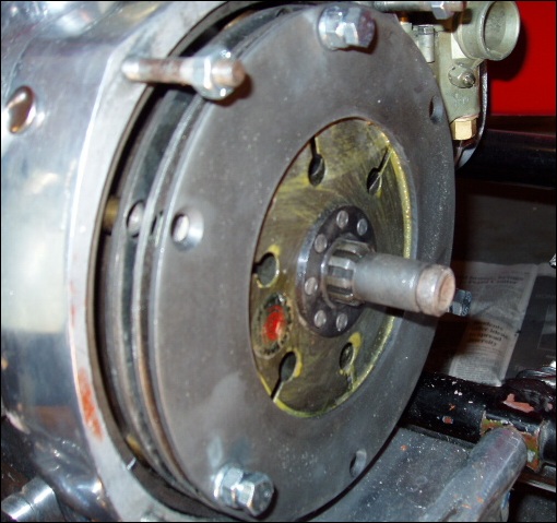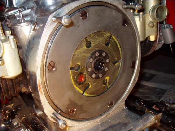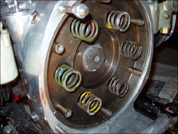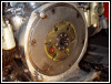 The Red Pig is back in service with some improvements including the fourth gear upgrade. Here's the flywheel with the clutch springs magically defying gravity. | ||||