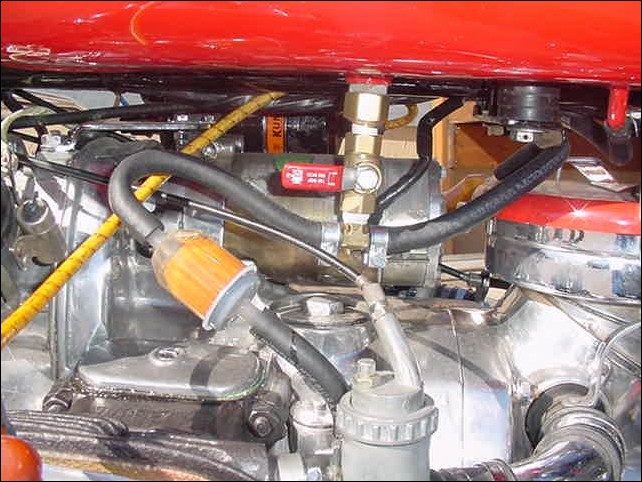 Improvised petcocks aren't unusual on CJs. Dariusz built this one using plumbing hardware. | ||||