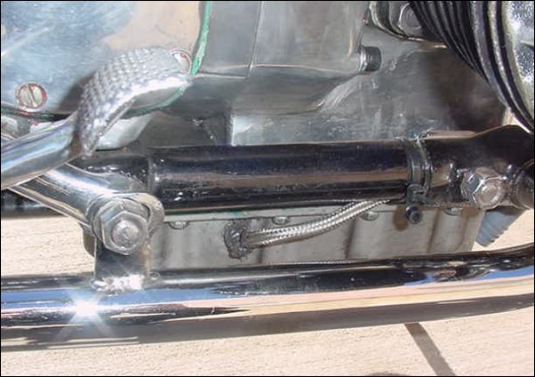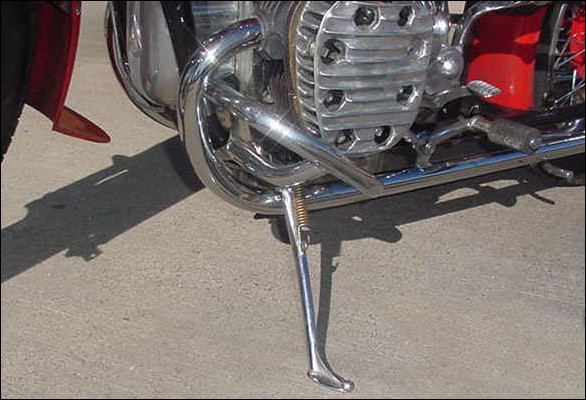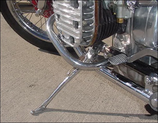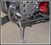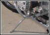Side stand improvised using parts from a motorcycle salvage yard. | ||||