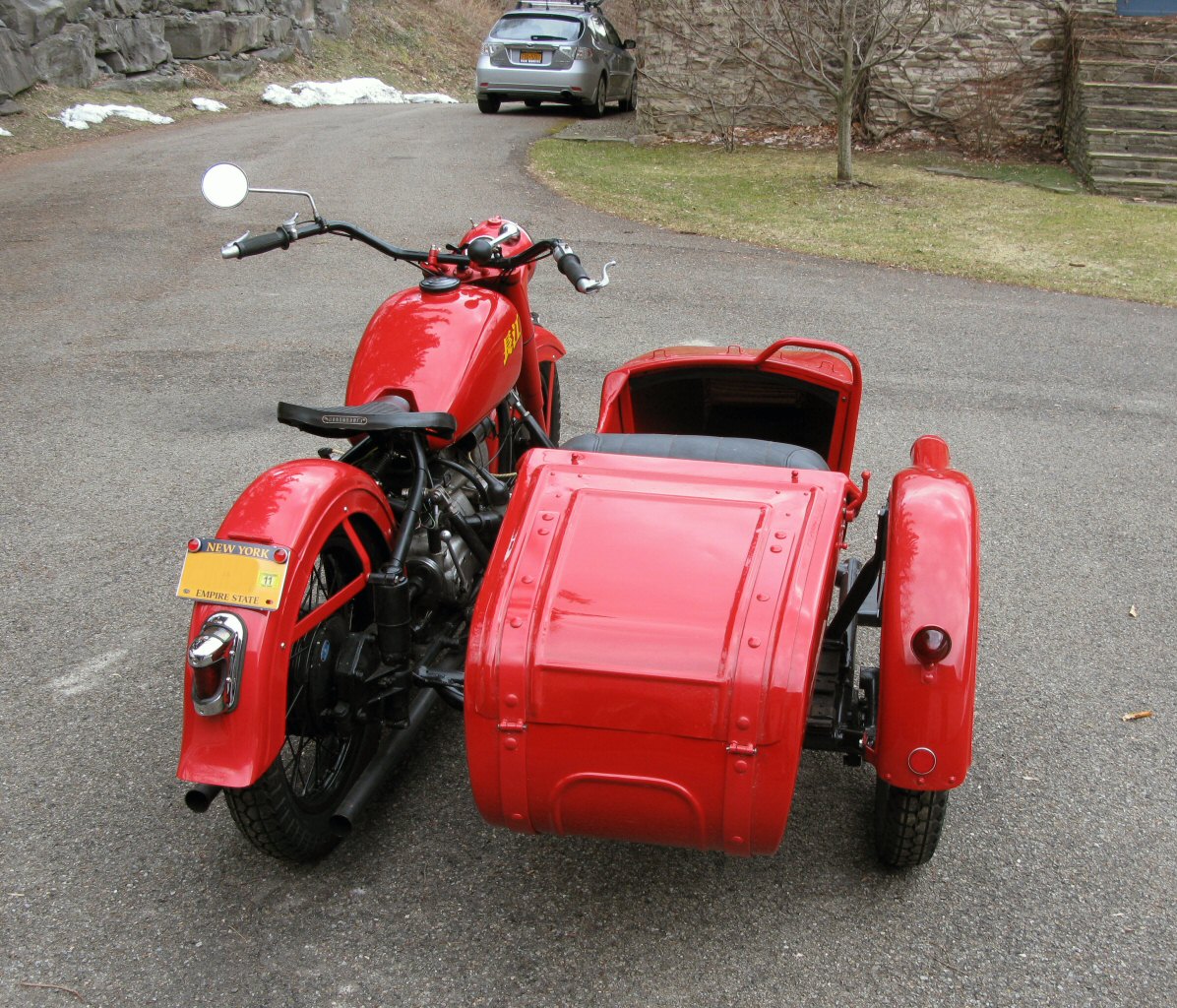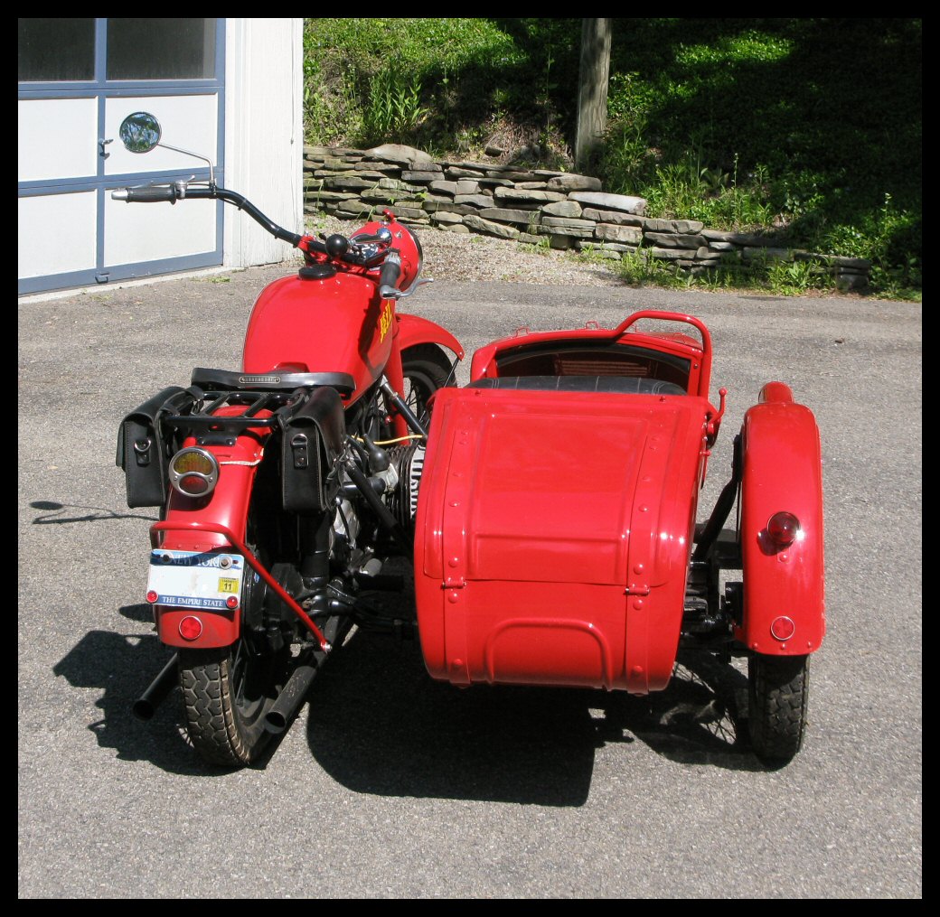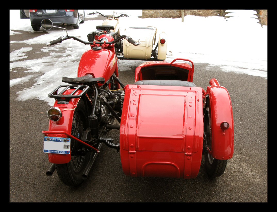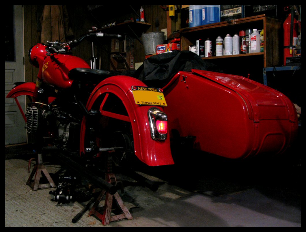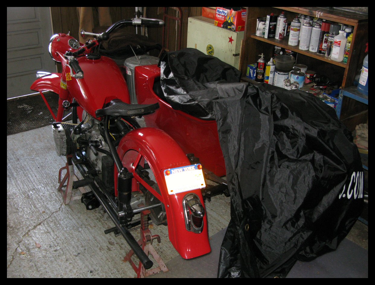 | Post-rebuild shakedown No pictures today, just words. There were indeed some teething problems, as expected. The new battery set me back $95! (I consider that a major teething problem.) It's a big honkin' car battery, the same model as before. With it mounted and the trunk wiring all connected, it was time to switch on the lights. Boing! My new Chinese sealed beam blew instantly, and neither of the sidecar lights worked. Crap. So, I got a Wagner headlamp from the local NAPA. As for the sidecar lights, I was convinced it was bad wiring, and wouldn't you know it? The battery in my Fluke meter was dead. I ran to the store for a new battery and resumed puttering. Well, there was indeed juice in all the right places. Turns out, both bulbs were bad! What a relief. Luckily, I have spares. I sure didn't want to do any rewiring. So, with all the lights finally working as they should, I started the bike. I figured it was gonna take half a dozen kicks, but I was off by maybe 100 or so. Both jugs were badly flooded due to the stupid plastic floats that I had forgot to switch over to brass. After making the switch, the bike finally fired up and boy howdy, did the paint on the jugs ever stink! It was that rust killer stuff I used under the stove paint. It's nasty! The bike seemed to run just fine, once it was unflooded, that is. Off to the insurance guy, then the DMV, and then for the dreaded shakedown run. "Shake" is a very good word to describe it because the front rim turned out to be bent from the wreck. No big deal, I'll just ride home and stick the tire on my last, decent stock CJ rim, and swap that wheel with the one on sidecar. Well... crap. The valve stem in the tire wouldn't let the air out of the tube, no matter how much I fiddled around. No big deal, I'll just buy a new tube. A few telephone calls confirmed what I already knew, the nearest source is 20 miles away. So, off to the H-D dealer in Gang Mills for an MM90 tube. The new tube is a Dunlop and it's by far the best one on the bike. It cost more than some of the tires did. Anyway, I got that mounted, and then noticed a growing gas puddle under the bike. Yes, there was gas leaking. It was leaking from the petcock, balance tube and both fuel lines. In other words, just about every place it could leak from. Crap. Today's first lesson: