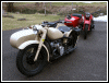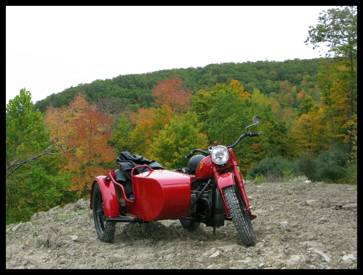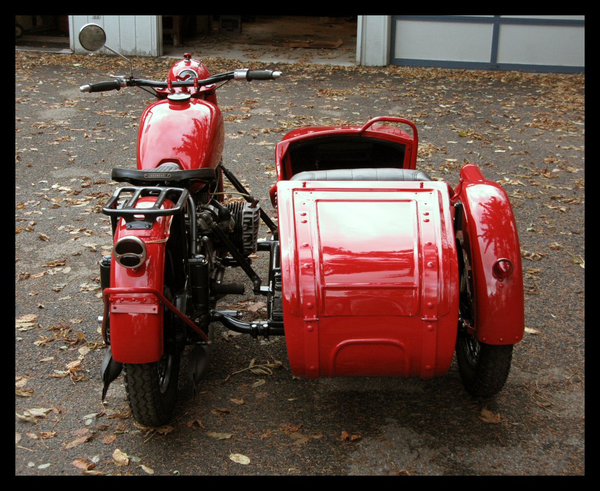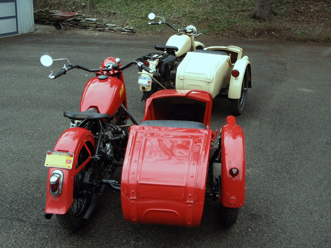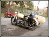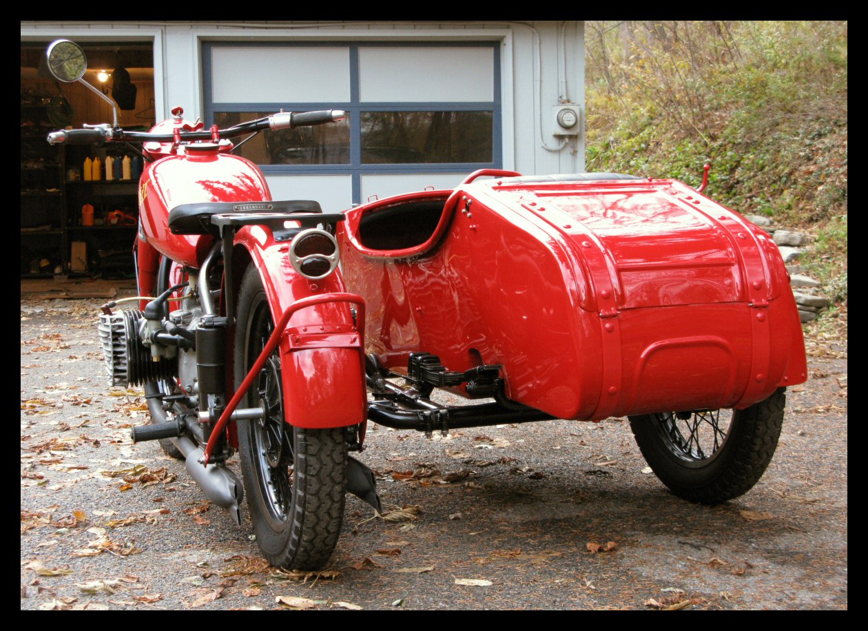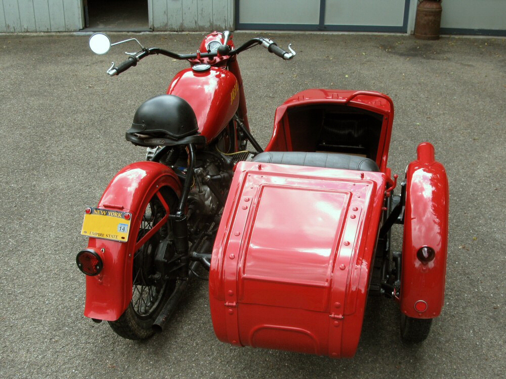 | Post-rebuild shakedown No pictures today, just words. There were indeed some teething problems, as expected. The new battery set me back $95! (I consider that a major teething problem.) It's a big honkin' car battery, the same model as before. With it mounted and the trunk wiring all connected, it was time to switch on the lights. Boing! My new Chinese sealed beam blew instantly, and neither of the sidecar lights worked. Crap. So, I got a Wagner headlamp from the local NAPA. As for the sidecar lights, I was convinced it was bad wiring, and wouldn't you know it? The battery in my Fluke meter was dead. I ran to the store for a new battery and resumed puttering. Well, there was indeed juice in all the right places. Turns out, both bulbs were bad! What a relief. Luckily, I have spares. I sure didn't want to do any rewiring. So, with all the lights finally working as they should, I started the bike. I figured it was gonna take half a dozen kicks, but I was off by maybe 100 or so. Both jugs were badly flooded due to the stupid plastic floats that I had forgot to switch over to brass. After making the switch, the bike finally fired up and boy howdy, did the paint on the jugs ever stink! It was that rust killer stuff I used under the stove paint. It's nasty! The bike seemed to run just fine, once it was unflooded, that is. Off to the insurance guy, then the DMV, and then for the dreaded shakedown run. "Shake" is a very good word to describe it because the front rim turned out to be bent from the wreck. No big deal, I'll just ride home and stick the tire on my last, decent stock CJ rim, and swap that wheel with the one on sidecar. Well... crap. The valve stem in the tire wouldn't let the air out of the tube, no matter how much I fiddled around. No big deal, I'll just buy a new tube. A few telephone calls confirmed what I already knew, the nearest source is 20 miles away. So, off to the H-D dealer in Gang Mills for an MM90 tube. The new tube is a Dunlop and it's by far the best one on the bike. It cost more than some of the tires did. Anyway, I got that mounted, and then noticed a growing gas puddle under the bike. Yes, there was gas leaking. It was leaking from the petcock, balance tube and both fuel lines. In other words, just about every place it could leak from. Crap. Today's first lesson: