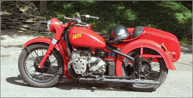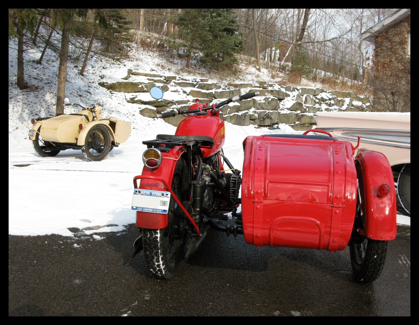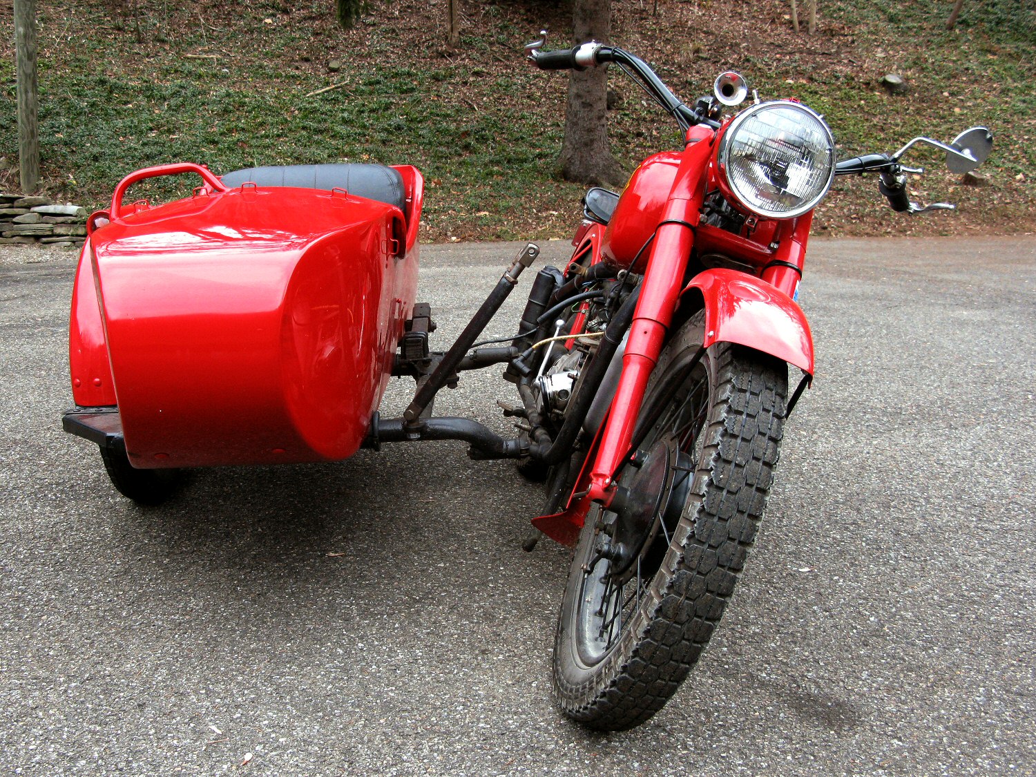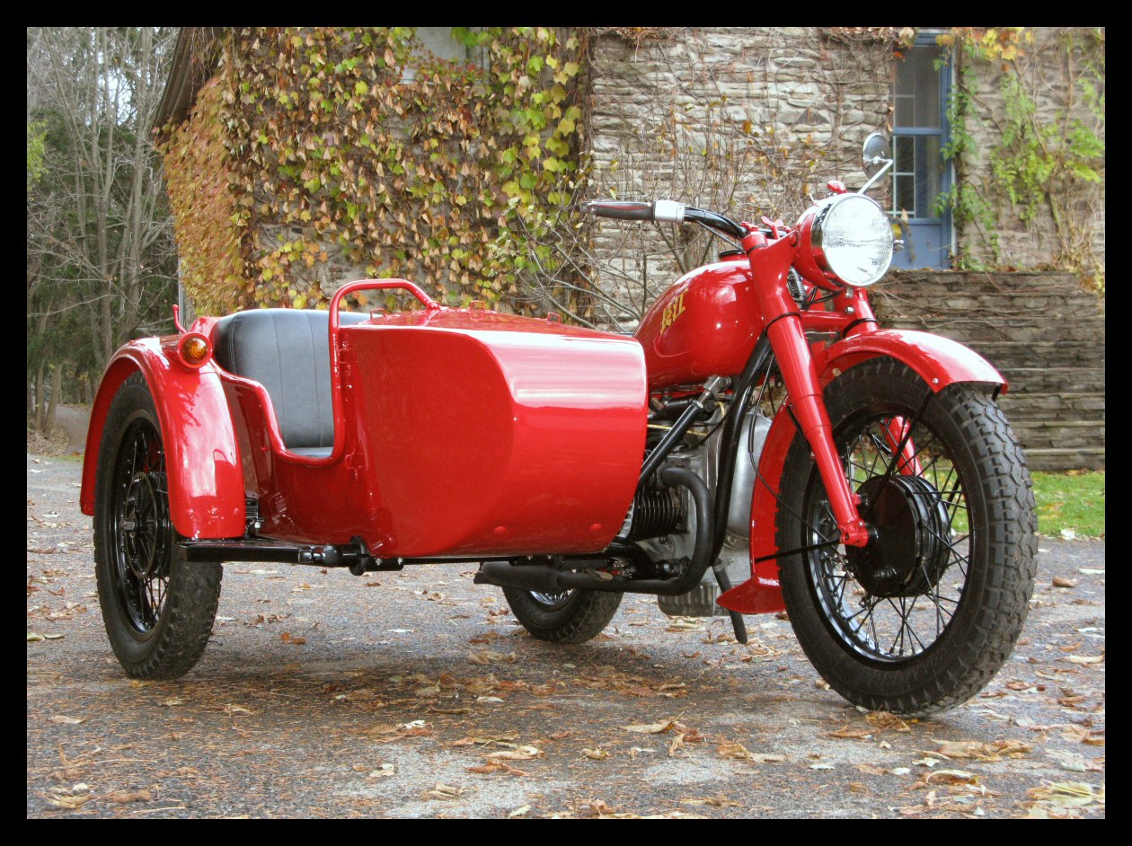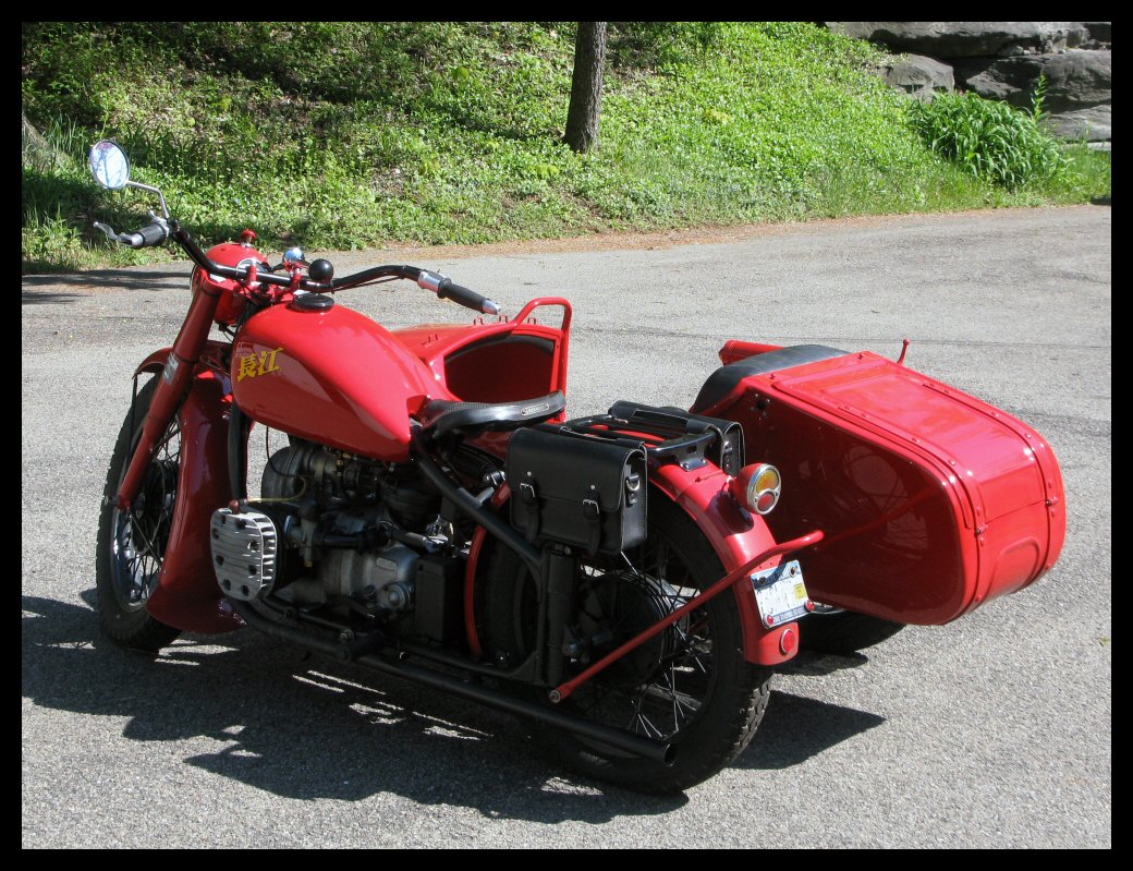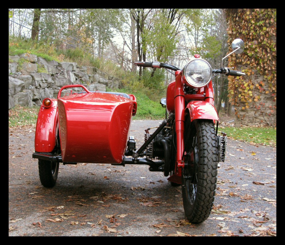 | Post-rebuild shakedown No pictures today, just words. There were indeed some teething problems, as expected. The new battery set me back $95! (I consider that a major teething problem.) It's a big honkin' car battery, the same model as before. With it mounted and the trunk wiring all connected, it was time to switch on the lights. Boing! My new Chinese sealed beam blew instantly, and neither of the sidecar lights worked. Crap. So, I got a Wagner headlamp from the local NAPA. As for the sidecar lights, I was convinced it was bad wiring, and wouldn't you know it? The battery in my Fluke meter was dead. I ran to the store for a new battery and resumed puttering. Well, there was indeed juice in all the right places. Turns out, both bulbs were bad! What a relief. Luckily, I have spares. I sure didn't want to do any rewiring. So, with all the lights finally working as they should, I started the bike. I figured it was gonna take half a dozen kicks, but I was off by maybe 100 or so. Both jugs were badly flooded due to the stupid plastic floats that I had forgot to switch over to brass. After making the switch, the bike finally fired up and boy howdy, did the paint on the jugs ever stink! It was that rust killer stuff I used under the stove paint. It's nasty! The bike seemed to run just fine, once it was unflooded, that is. Off to the insurance guy, then the DMV, and then for the dreaded shakedown run. "Shake" is a very good word to describe it because the front rim turned out to be bent from the wreck. No big deal, I'll just ride home and stick the tire on my last, decent stock CJ rim, and swap that wheel with the one on sidecar. Well... crap. The valve stem in the tire wouldn't let the air out of the tube, no matter how much I fiddled around. No big deal, I'll just buy a new tube. A few telephone calls confirmed what I already knew, the nearest source is 20 miles away. So, off to the H-D dealer in Gang Mills for an MM90 tube. The new tube is a Dunlop and it's by far the best one on the bike. It cost more than some of the tires did. Anyway, I got that mounted, and then noticed a growing gas puddle under the bike. Yes, there was gas leaking. It was leaking from the petcock, balance tube and both fuel lines. In other words, just about every place it could leak from. Crap. Today's first lesson: