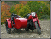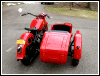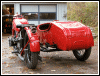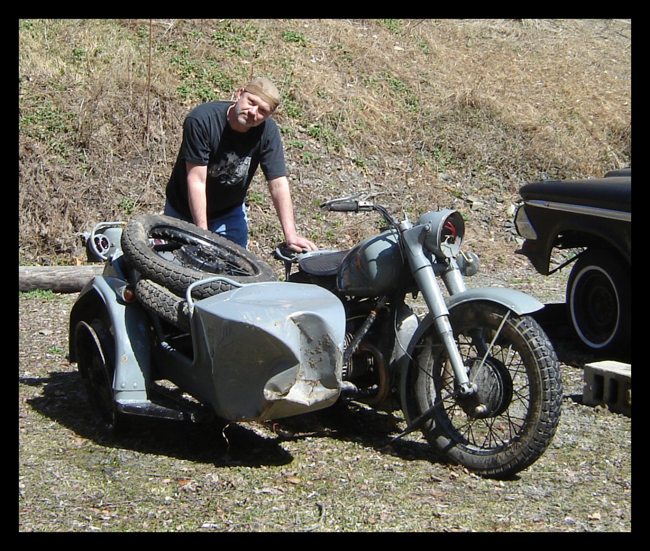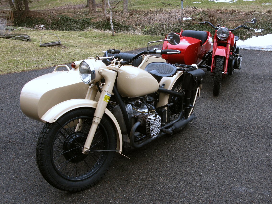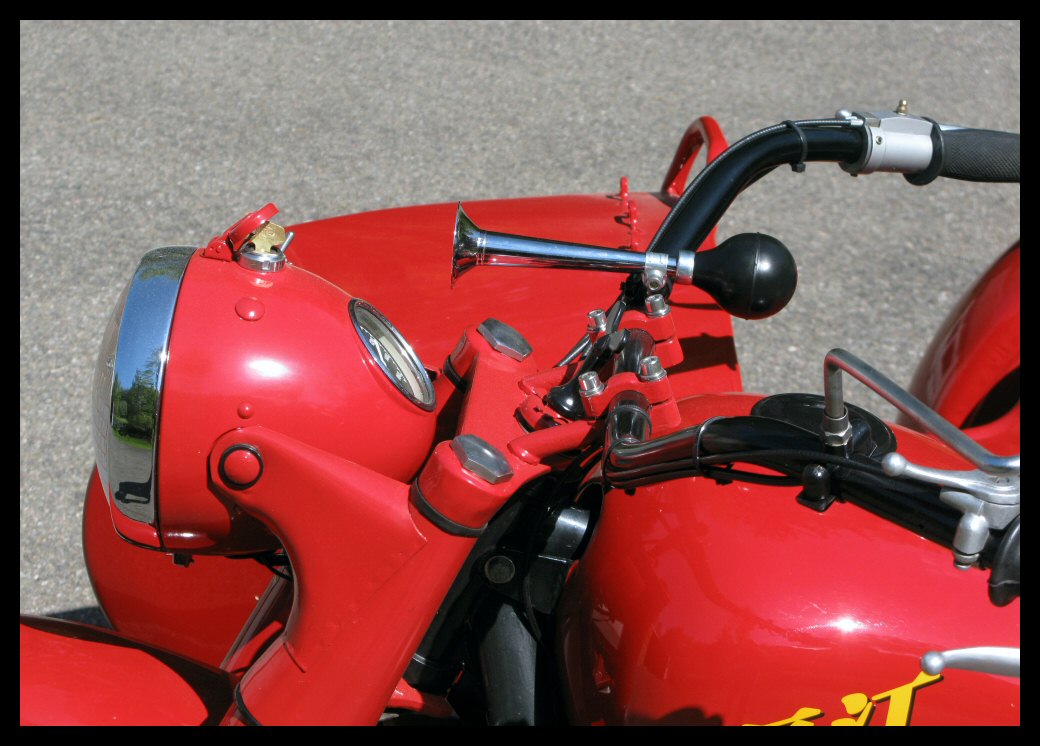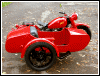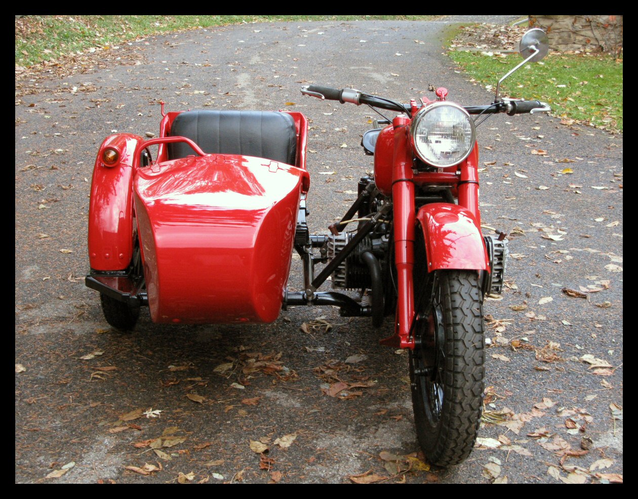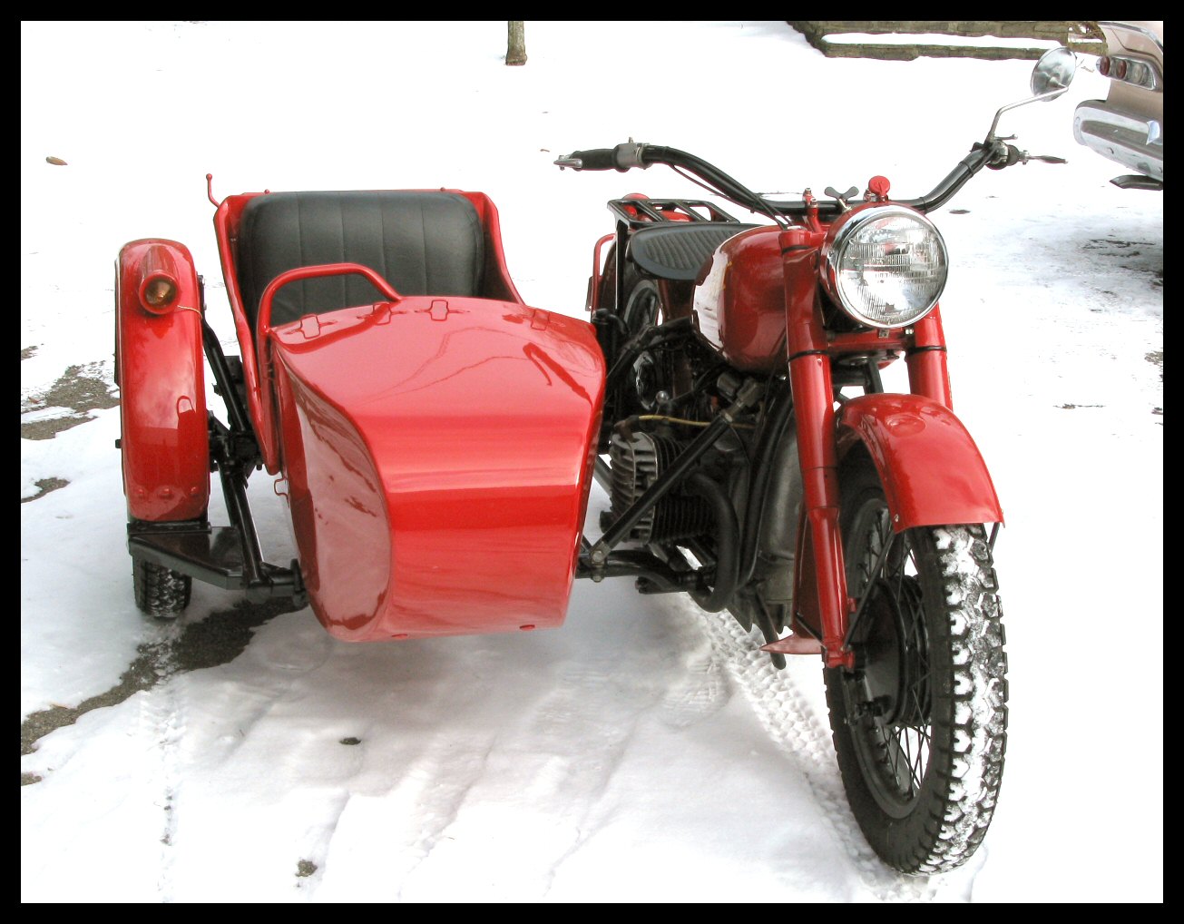 | Post-rebuild shakedown No pictures today, just words. There were indeed some teething problems, as expected. The new battery set me back $95! (I consider that a major teething problem.) It's a big honkin' car battery, the same model as before. With it mounted and the trunk wiring all connected, it was time to switch on the lights. Boing! My new Chinese sealed beam blew instantly, and neither of the sidecar lights worked. Crap. So, I got a Wagner headlamp from the local NAPA. As for the sidecar lights, I was convinced it was bad wiring, and wouldn't you know it? The battery in my Fluke meter was dead. I ran to the store for a new battery and resumed puttering. Well, there was indeed juice in all the right places. Turns out, both bulbs were bad! What a relief. Luckily, I have spares. I sure didn't want to do any rewiring. So, with all the lights finally working as they should, I started the bike. I figured it was gonna take half a dozen kicks, but I was off by maybe 100 or so. Both jugs were badly flooded due to the stupid plastic floats that I had forgot to switch over to brass. After making the switch, the bike finally fired up and boy howdy, did the paint on the jugs ever stink! It was that rust killer stuff I used under the stove paint. It's nasty! The bike seemed to run just fine, once it was unflooded, that is. Off to the insurance guy, then the DMV, and then for the dreaded shakedown run. "Shake" is a very good word to describe it because the front rim turned out to be bent from the wreck. No big deal, I'll just ride home and stick the tire on my last, decent stock CJ rim, and swap that wheel with the one on sidecar. Well... crap. The valve stem in the tire wouldn't let the air out of the tube, no matter how much I fiddled around. No big deal, I'll just buy a new tube. A few telephone calls confirmed what I already knew, the nearest source is 20 miles away. So, off to the H-D dealer in Gang Mills for an MM90 tube. The new tube is a Dunlop and it's by far the best one on the bike. It cost more than some of the tires did. Anyway, I got that mounted, and then noticed a growing gas puddle under the bike. Yes, there was gas leaking. It was leaking from the petcock, balance tube and both fuel lines. In other words, just about every place it could leak from. Crap. Today's first lesson: