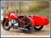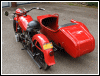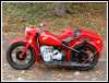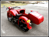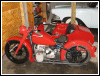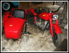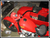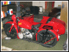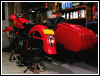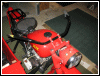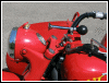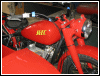 | Almost seven months to the day, this bike tumbled end over end down a pipeline trail, and back in June, 2004, she got clobbered by an Oldsmobile. I wonder what's gonna happen next. If there is another incident, we'll see how she looks in powder blue. For now, she's red. I rolled her out for an unveiling even though she's technically not finished. The battery must have got damaged in the wreck as it seeps acid out the bottom. Monday, I'll buy a new one and finish the wiring inside the trunk. I'll also be visiting the DMV for a new license plate, and then we'll really see if she's as good a runner as before. I expect a few shake-down issues, particularly with the 28mm carbs since they're brand new and have never been run. | |||||