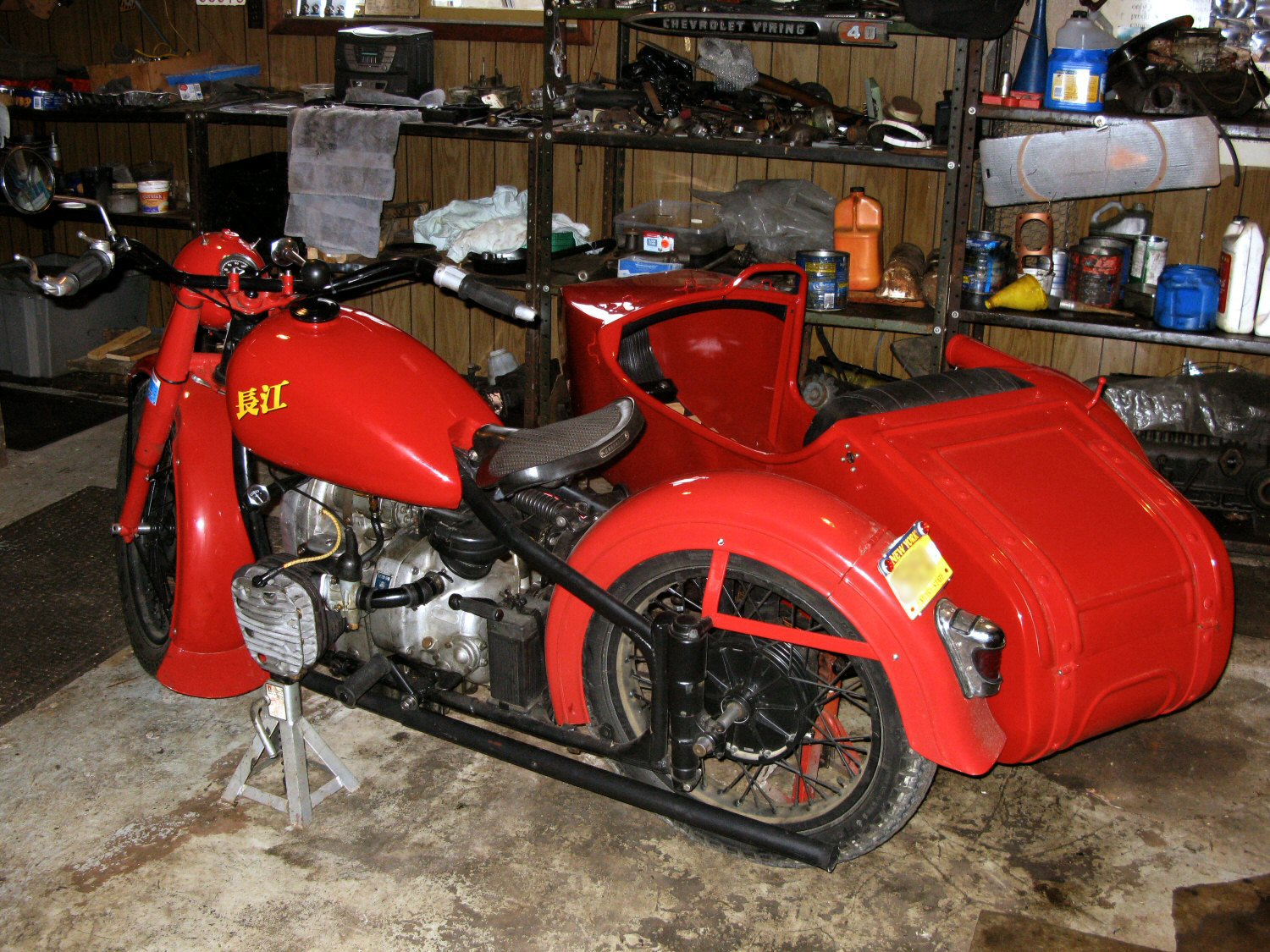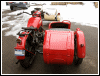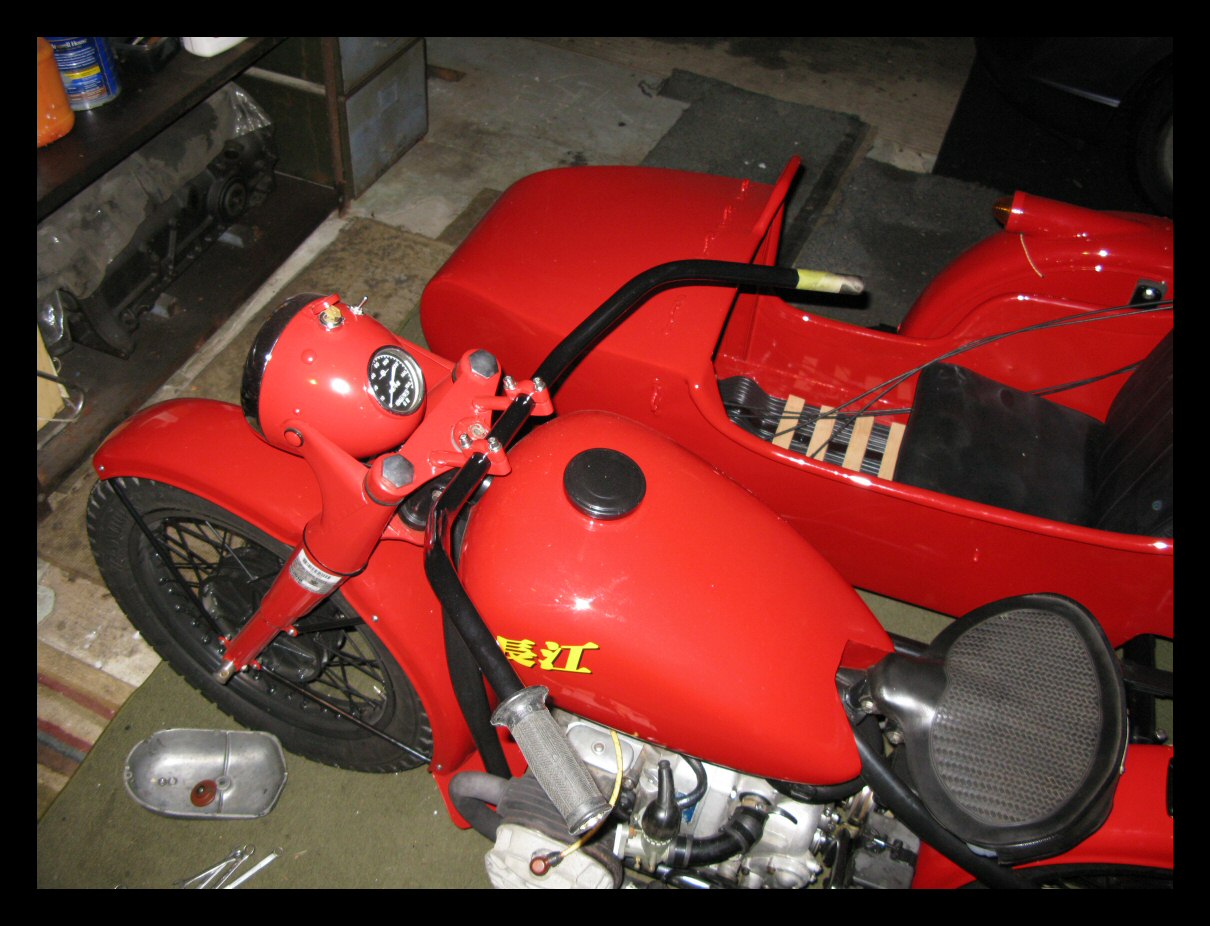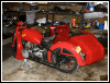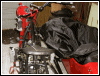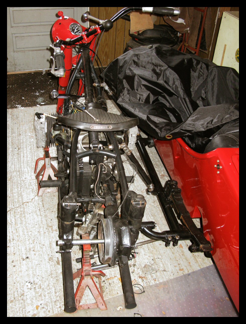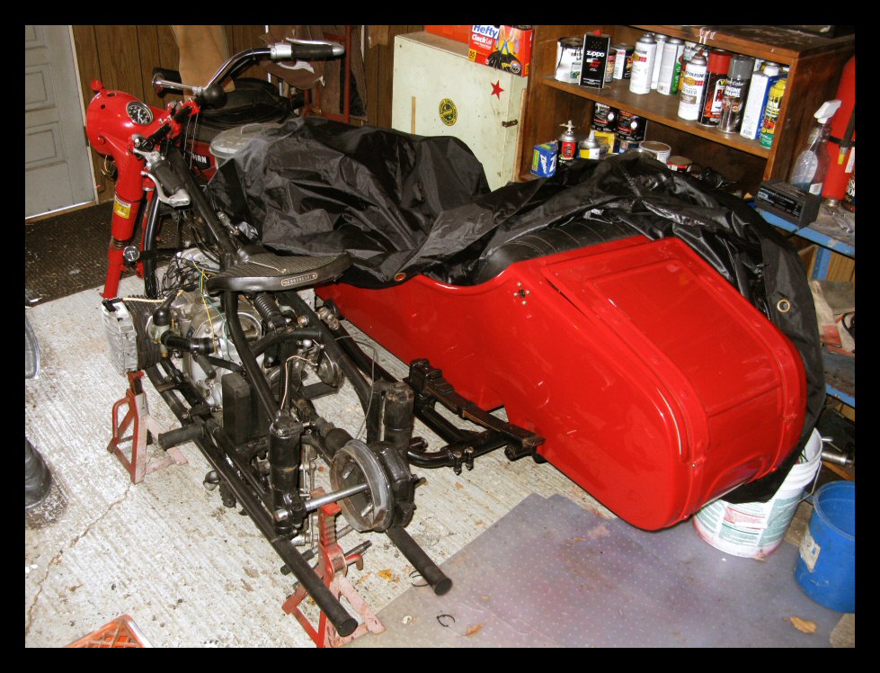 Pulling that starboard jug is so much easier when you have room to work. I disconnected the upper sidecar braces and loosened the clam shells so the bike could be tilted away from the sidecar. It will probably be necessary to take this a step further when the jugs go back on. | |||