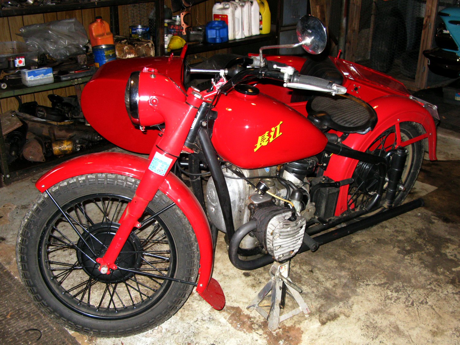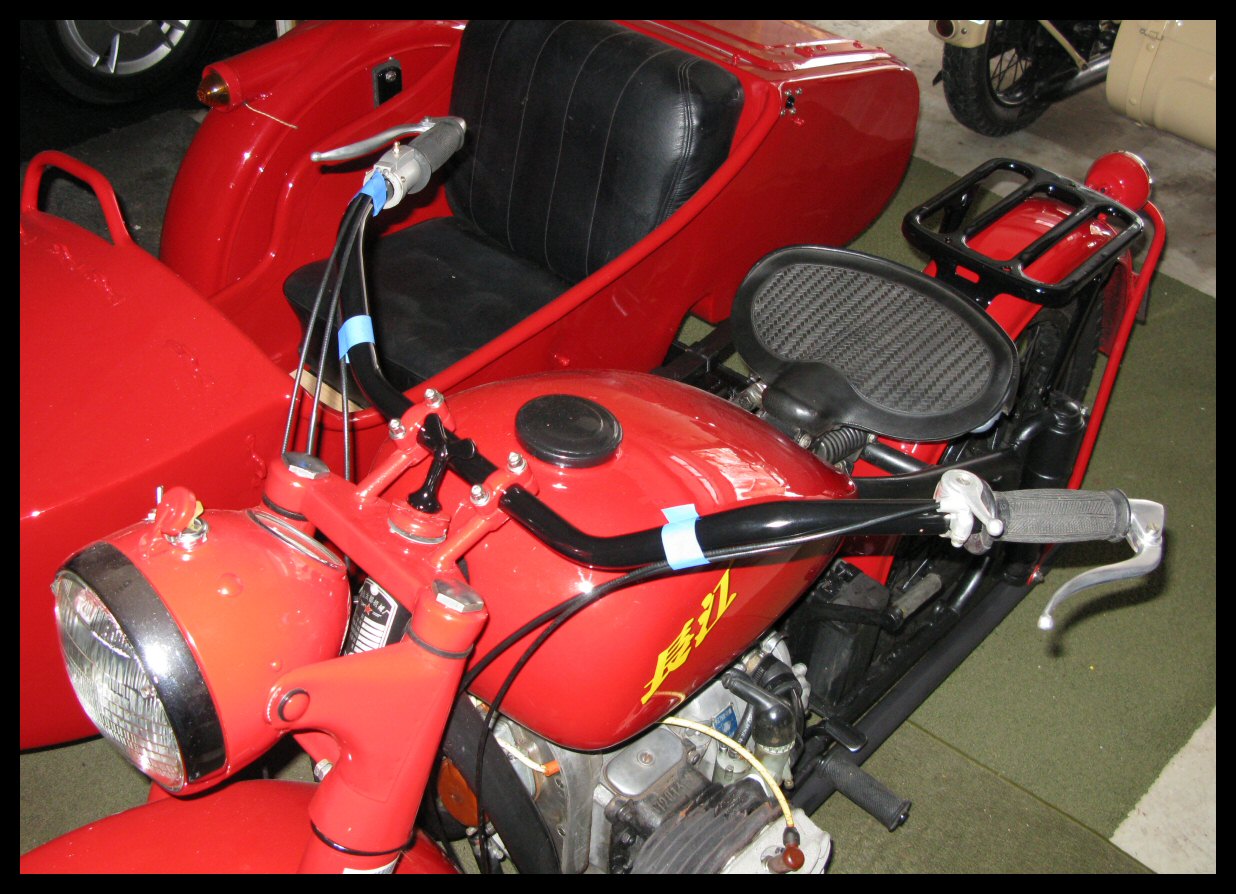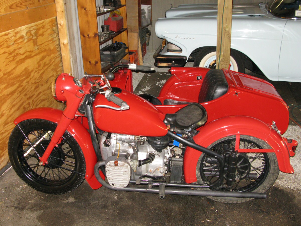 Pulling that starboard jug is so much easier when you have room to work. I disconnected the upper sidecar braces and loosened the clam shells so the bike could be tilted away from the sidecar. It will probably be necessary to take this a step further when the jugs go back on. | |||