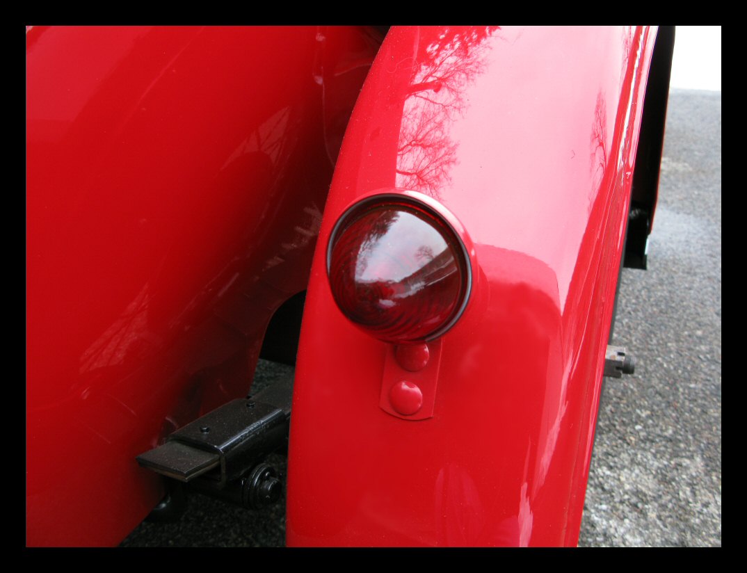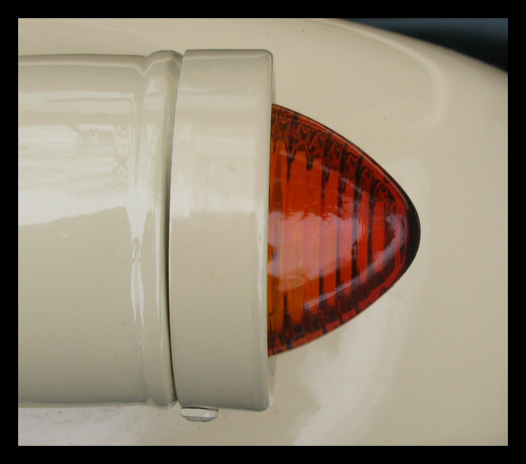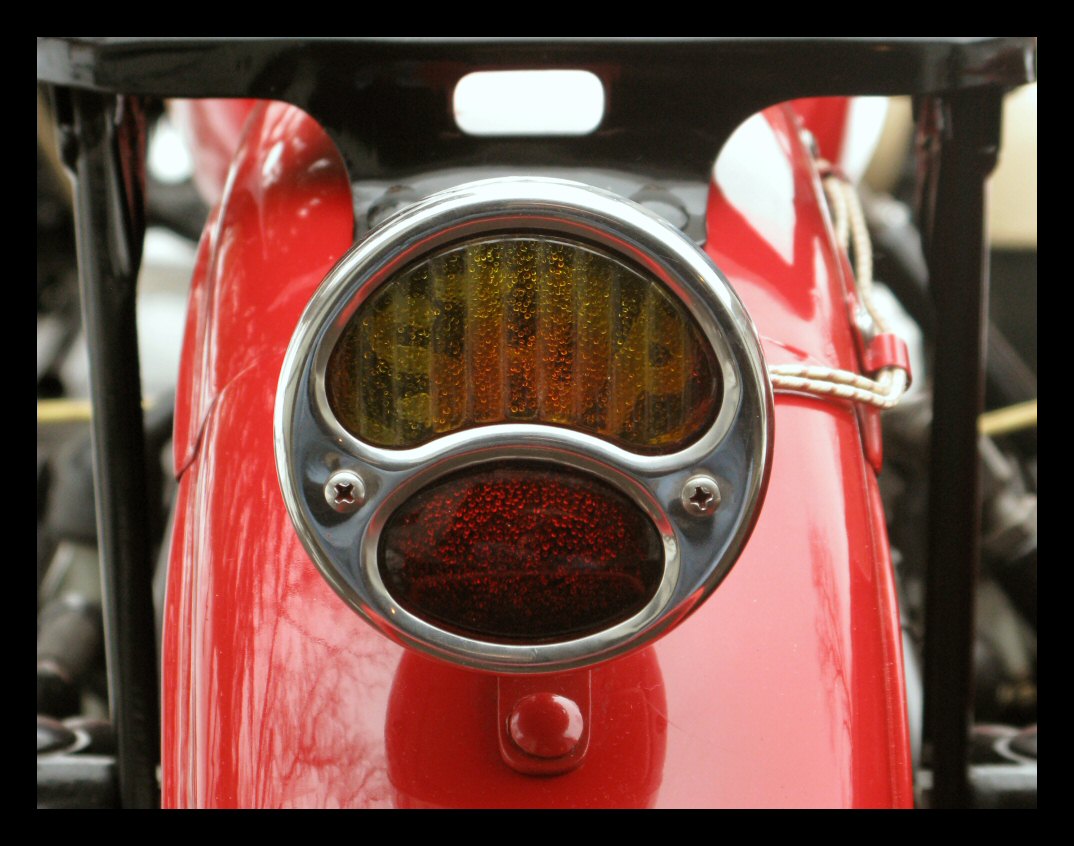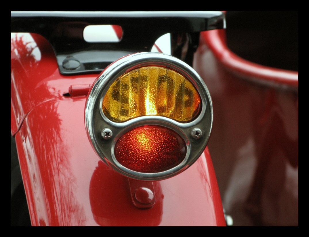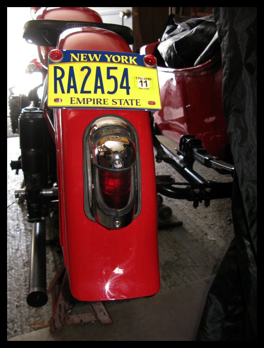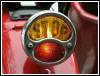 I've been swapping stuff around with the other bike and, in the process, found this nifty glass taillight lens that fits the Model A bezel perfectly. The brake light portion is amber while the running light portion is red. Will it pass inspection? Will the cops dislike it? Guess we'll see. | |||