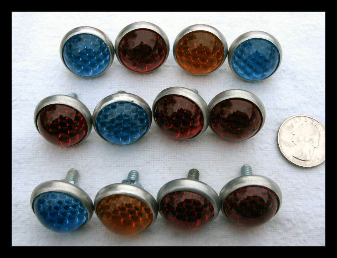 Older motorheads will recognize these babies. They're little license plate reflectors. These particular ones have domed glass reflectors. They're getting hard to find for realistic money, sometimes offered on eBay for $15 each! I found a place that sells them NOS for $4. | ||||