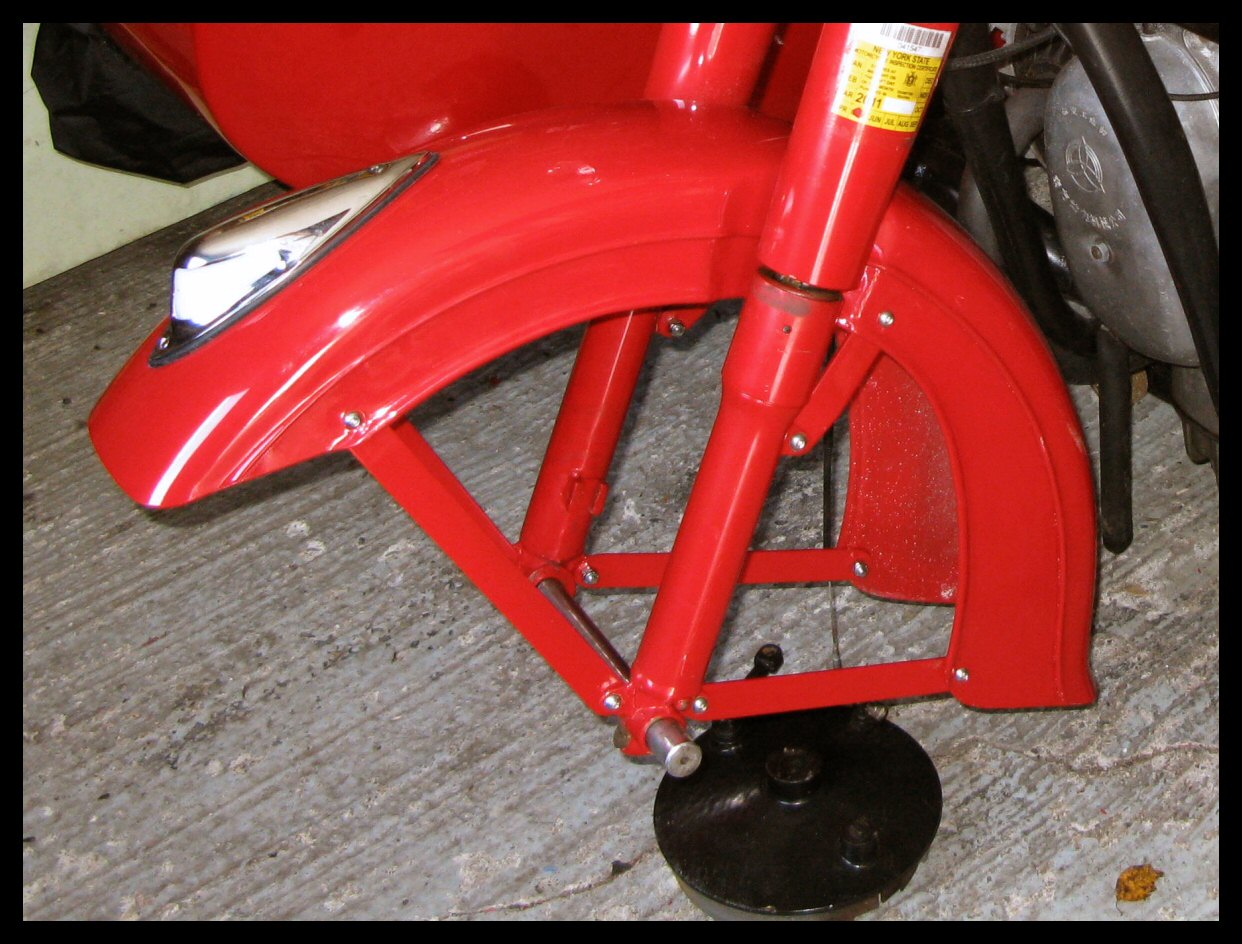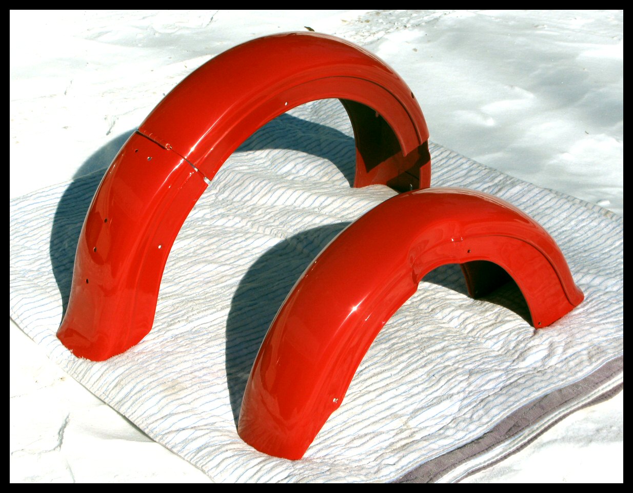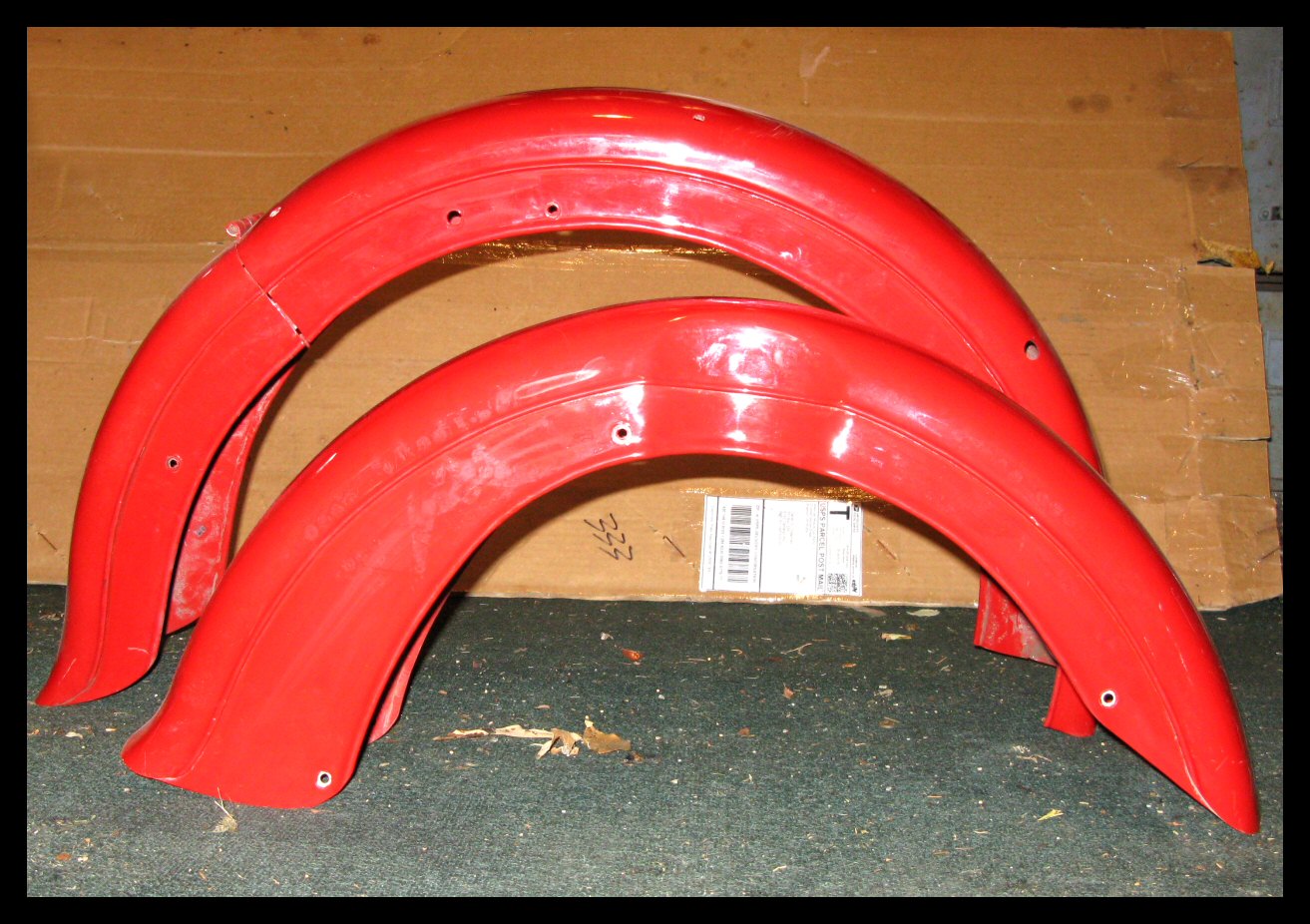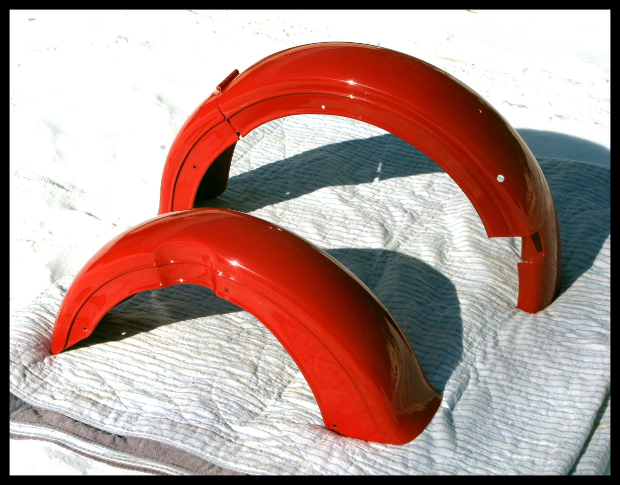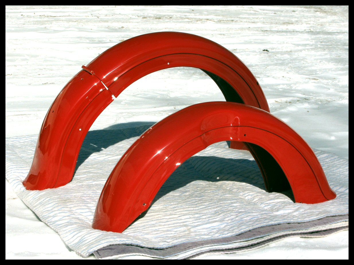 But finally, after weeks and weeks, the fenders are done! The shop did a magnificent job on them, and they'll be mounted on the bike tomorrow. The two-toning will be done by me if I can ever decide. | ||