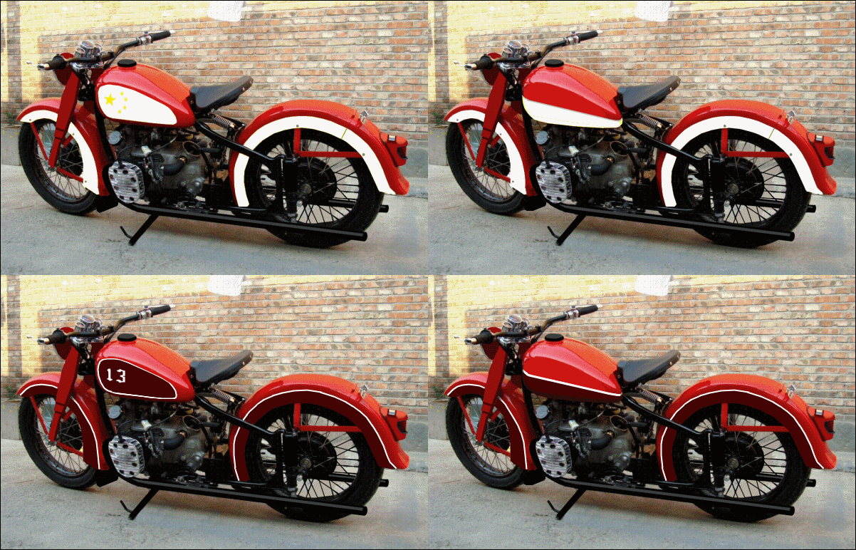 In deciding how to go about painting the H-D fenders, I took an old picture of TK's bike and tried some ideas with Paintshop. | ||||