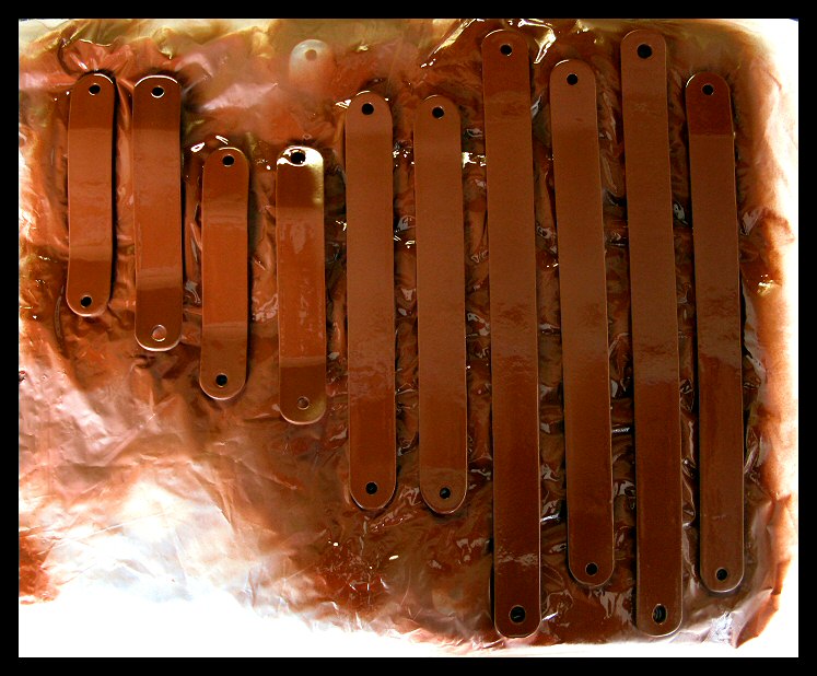 These are the brackets for the new fenders. The metal was full of pits so the primer is going on thick. They'll be wet sanded and reprimed until there's a smooth painting surface. The fenders are at a body shop where holes are being filled and big indentations are being removed. | ||||
