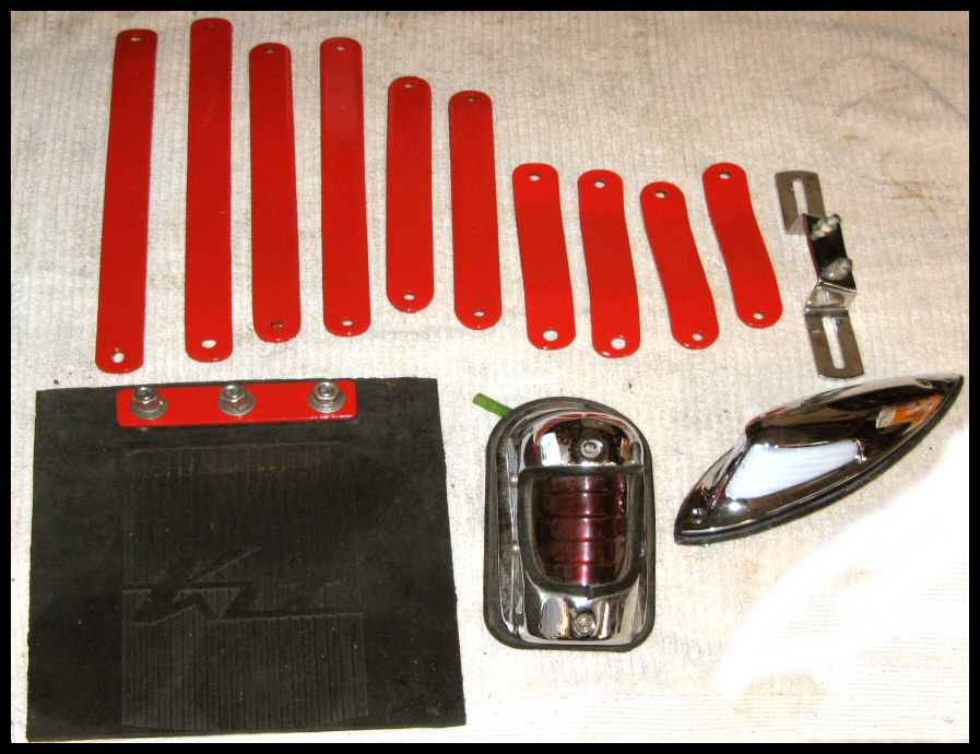 Here are the fender brackets, front mudflap, license plate bracket, H-D taillight and front fender running light. The paint job on the fender brackets turned out better than expected. | ||||