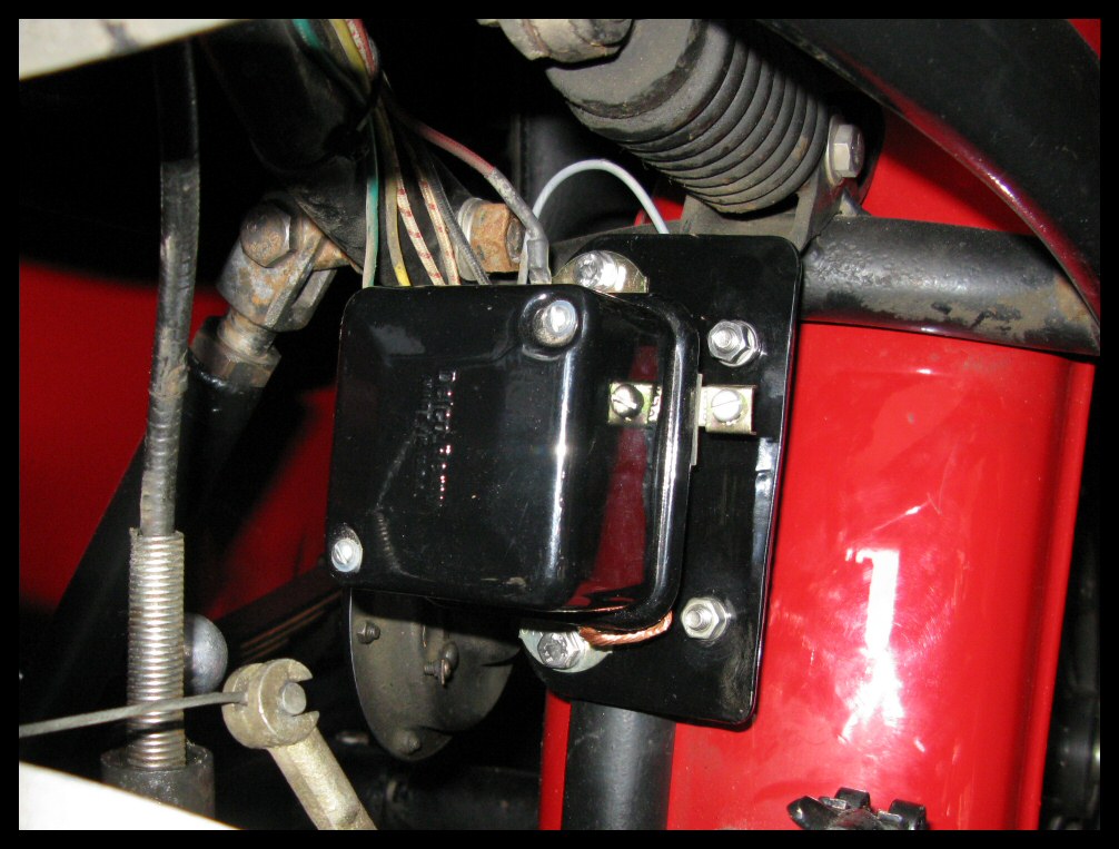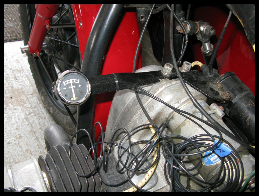 The electrical system on this bike will be identical to the setup on my other bike. The first picture shows the Delco-Remy 575 regulator. The second one shows the ammeter, mounted the best way I could come up with. My only concern is vibration from the engine. | |||