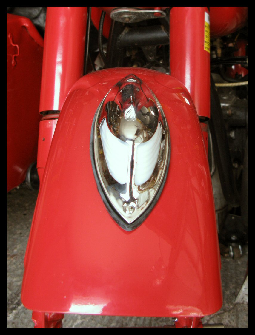 The unthinkable has happened. The tan bike now sports a chrome headlight bezel instead of the painted visor. The red bike provided the inspiration for this and other paint mods that will happen this winter. | |||