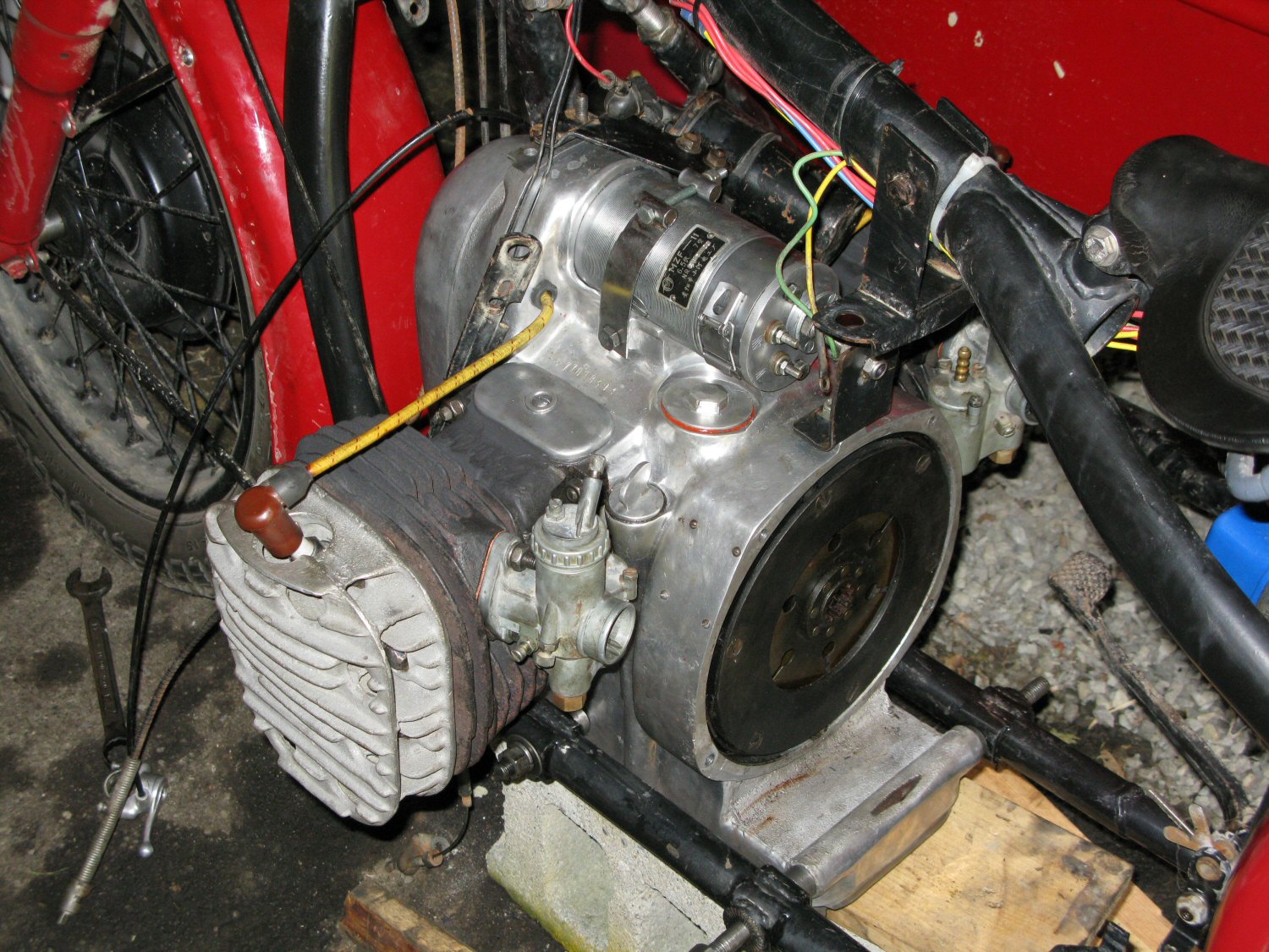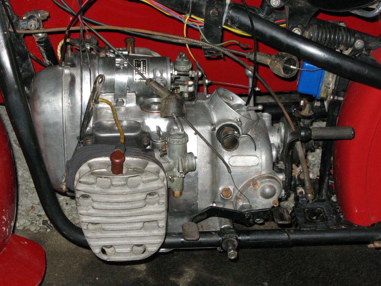 | It's a done deal... until the next time, that is. The red bike is back together and running like a Rolex. (Well, idling in the driveway, anyway.) The shakedown will be tomorrow, and I'll be packing tools, parts, a cell phone and my trusty old Triple A card (based on past experiences). Actually, I think she'll be A-okay. Dan Cason provided some of his legendary technical expertise with regards to valve timing, all very much appreciated. For anyone who's interested, you should always use a timing gear that's matched to the shaft. The location of the keyways can vary, and therefore the location of the timing mark relative to whatever shaft it's going on. Yes, believe it or not, these parts are not standardized in this respect. Hard to imagine, but seeing is believing. This is a potential cause of untold heartbreak for someone who's not hip to it. | |||||