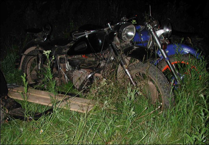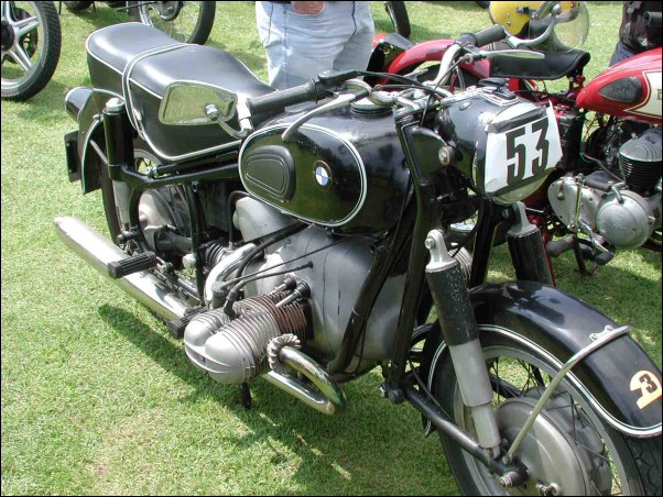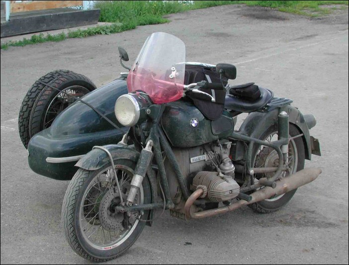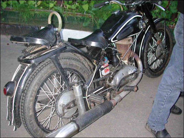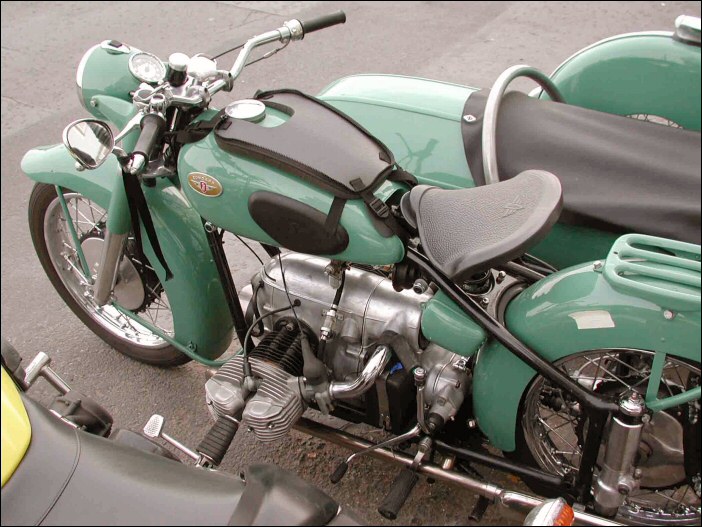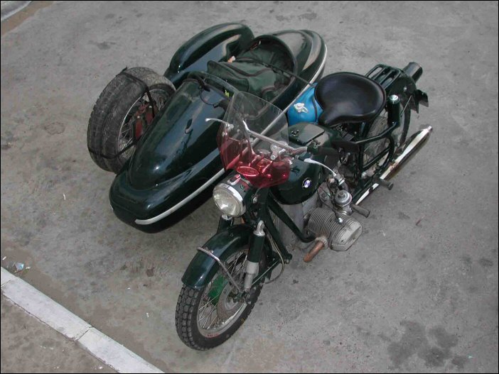 The red bike is a BMW R80-RT (thanks Holger.) The green machine is a Zundapp. I'll guess it's from the mid-fifties. | ||||
