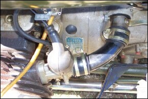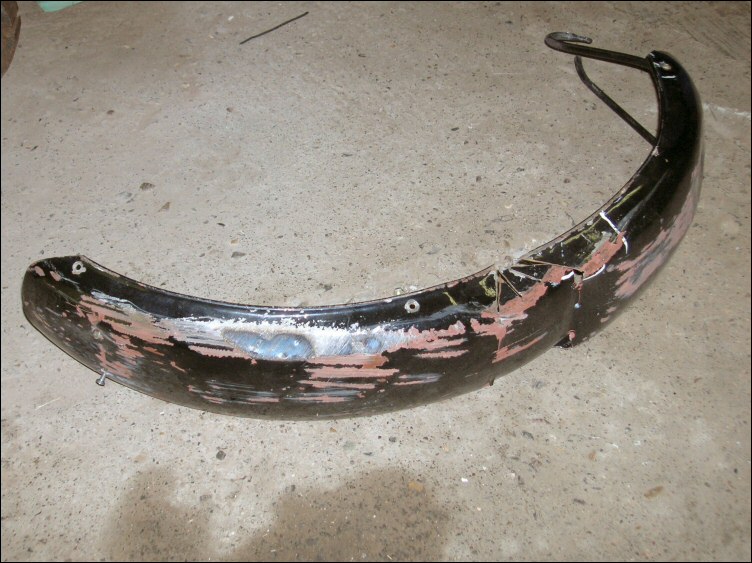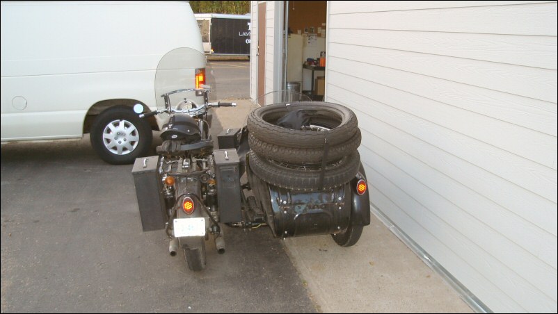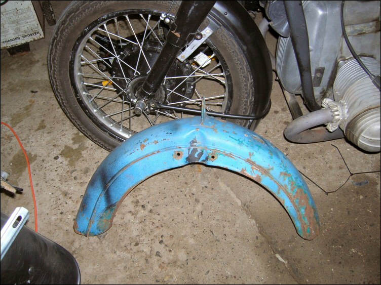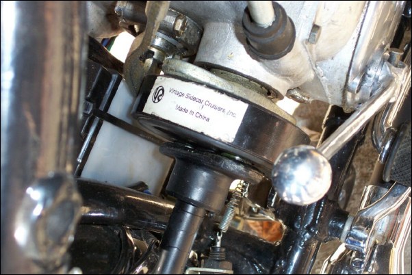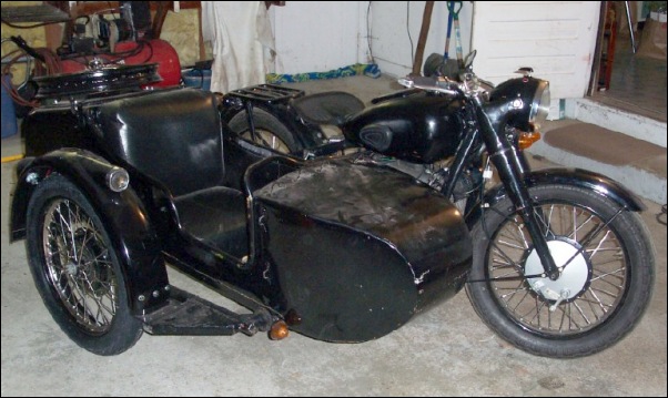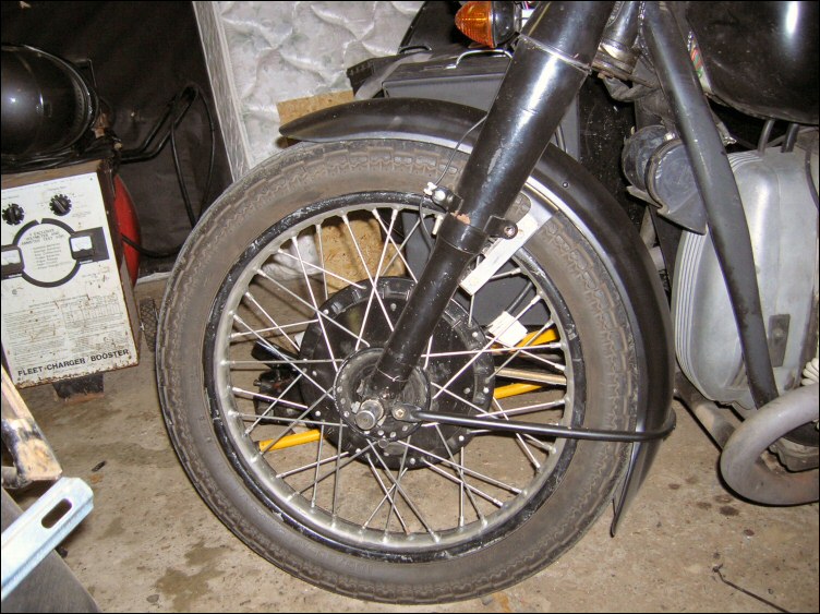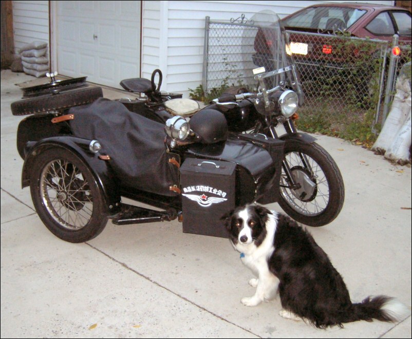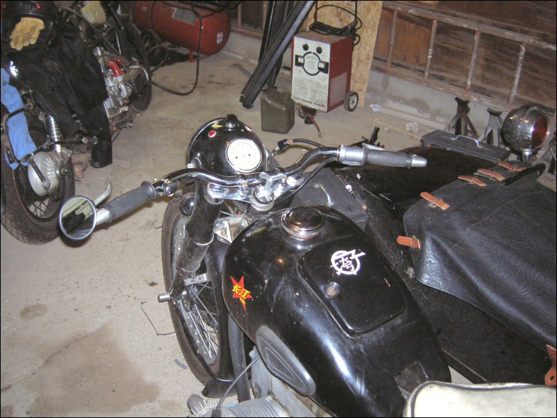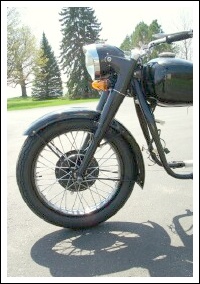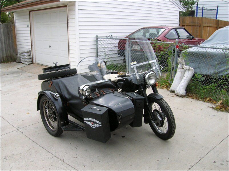 with no air cleaner look is better. On the way to a bike meet in August my clutch cable lost an end at the handlebar. I still had about 20 miles to go so I just faked it and cruised the back way without releasing the clutch. I only stalled once at a left hand arrow and managed to get going again with a four step run-and-gun when the light changed. It's surprising how fast you can get a heavy sidecar rig pushed through an intersection when you have to... I found a Honda cable that works fine with the sheath cut back about 2" at the transmission adjusting bracket. The part number is 17910-VA5-000. I have no idea what it's from but it's been on the bike for a couple months and is actually easier to pull than the stock cable. It's thinner than the Chinese version but Honda quality should make up for that. Anyway, it's a good emergency option or good replacement. I'm too lazy to order one from China. Last month while I was on a speed run home (having just seen The World's Fastest Indian the night before, I was playing Bonneville Racer) and probably going WAY too fast! (I bought a bicycle speedo to accurately measure speed. It uses a rare-earth magnet on the front rim and works great. Also computes mileage, distance, average speed and tells me how many calories I've burned based on age and weight. According to the readout I've burned so many calories I should weigh about 5 lbs.) Anyway, I was blasting through a construction zone when some debris either broke one of my fender mounting brackets or became wedged under the back end of the fender. Next thing I know the fender has caught the front wheel, ripped off forward and over, and is dragging under the engine block hanging on by one bracket and probably shooting sparks out for several feet behind me. Aside from knocking the headlight up a bit I didn't feel a thing. The bike tracked straight and I pulled over with no problems. I unbolted the one remaining brace, threw the remains in the sidecar and continued on home. The only serious damage was a broken mounting bracket on the fork, but that's an excuse for me to try out my MIG welder. I fabbed up a quickie replacement using one of my spare goldwing front fenders (for some reason I have three of them) and ordered that blue fender from Red October. It's from an old Ural, probably an M66 and has more of a valence to the sides than the CJ fender. Should look pretty good when I get it painted and mounted. It must have looked awfully pretty for the commuters behind mesparks shooting out everywhere. Reminds me of the time I did a complete 360 on an icy freeway in Michigan while driving my 24-foot long 1973 Pontiac hearse (long gone now). That's another one where I wish someone had been behind me with a video camera..." |