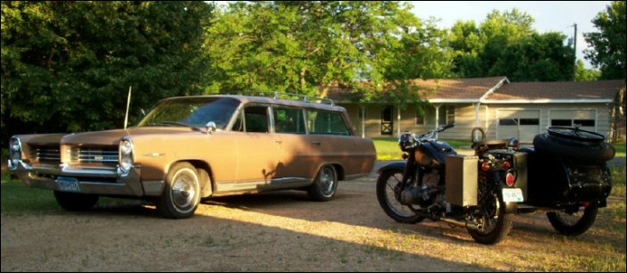 | Before we talk about the bike, feast your eyes on Mark's '64 Bonneville wagon. Is that a cool car or what? | |||||