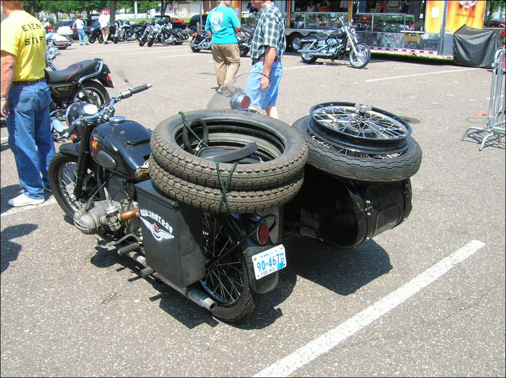 "Here's pics from the vintage MC show today in St Paul, MN. One of the best sidecar rigs I've run acrossa heavily modified 90/6 with earles forks, 15" wheels, custom sidecar frame, 1955 Steib sidecar body, MG sidecar wheel, Heinrich tank, etc..." | ||||