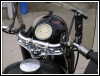 "The bars are farther forward and just a bit lower, much more comfortable on my back. Today I spent the afternoon modifying the bar mounts, basically turned them around and used the clamping holes and some spacers to mount the bars on the triple tree just forward of the steering damper." | ||||