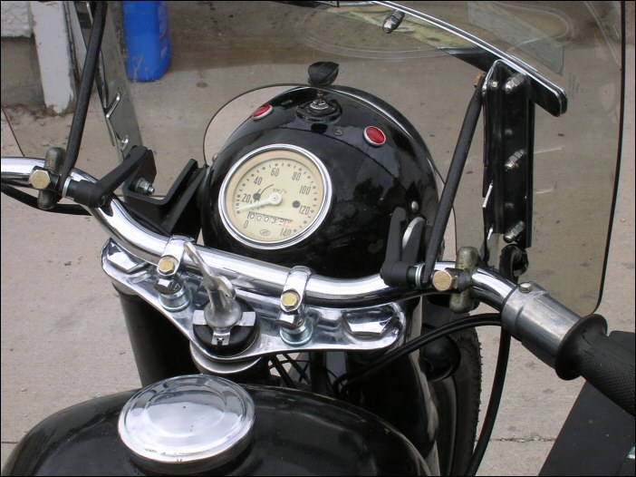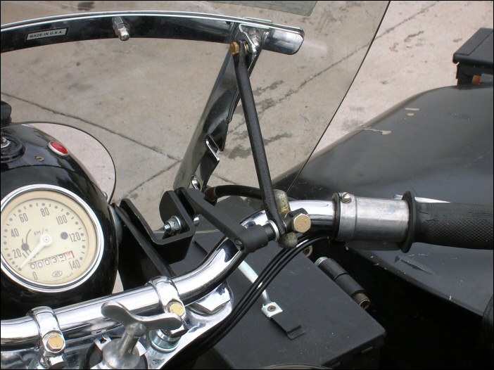 | "Here's a couple more picsthe windscreen is mounted on the bike using a pair of CJ mirror mounts, the middle fender braces from my old lowered fender, a couple trailer hitch brackets from Fleet Farm and some screw adjusters scrounged from work. The front mounts (trailer hitch "u" brackets) rest on the headlight bolts (from an old Honda) and the braces are attatched to the handlebars with the screw adjusters. The entire thing comes off in about 10 seconds. I originally had it mounted in front of the key but it works better a bit aft of the ignition. The windscreen is the generic cruiser/Harley style bought off eBay. The sidecar windscreen is from an old Luftmeister fairing I had lying around and a set of Steib TR500 windscreen mounts (somewhat modified). I am the king of the scroungers." | |||||