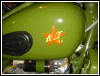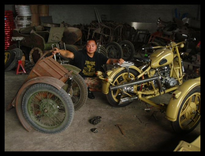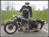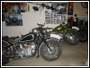 | Miin's new OHV sidecar from CJS (left) is still about four weeks from deliveryand Miin can hardly wait. Luckily his new flathead solo (right) has arrived, also a CJS bike. Look how good the swoosh emblem looks with that paint job. I like it. | |||||