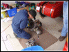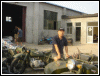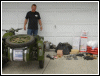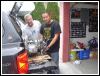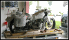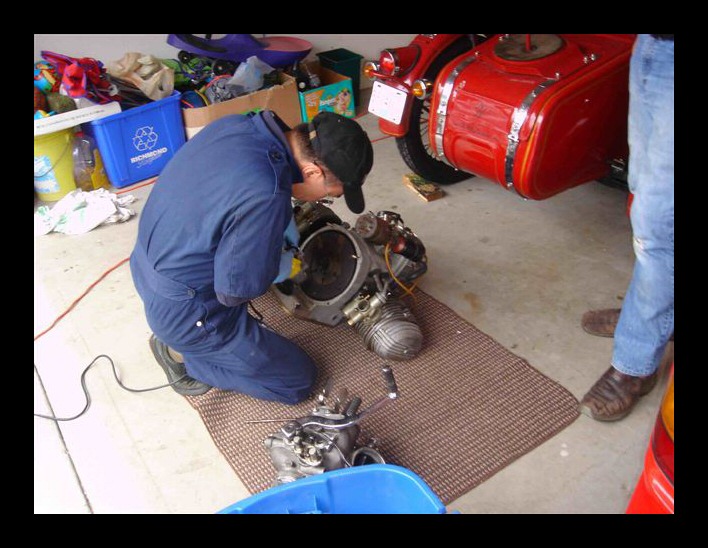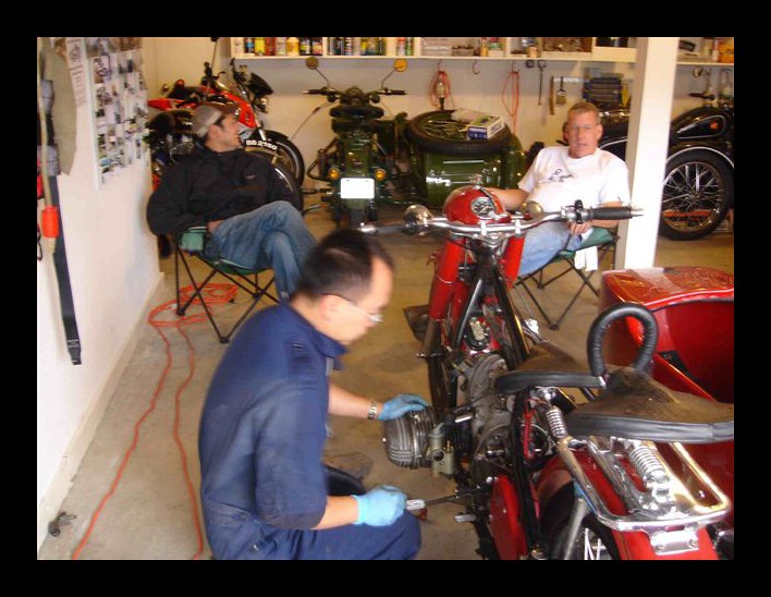 | "Mr. Nice Guy Erv let his buddy borrrow his CJ for over a month. Looks like his buddy forgot to add oil when he told him the bike was low on oil. There were less than 1-1/2 cups of oil in the pan when the engine finally siezed. Good thing I ordered a spare motor two years ago. Erv and I, after thee hours of re and re-motoring, the bike was running again. The new engine had to be ground down at the rear to fit the old gearbox. Our talk too much supervisors Henk and Bryan sat on chair drinking and laughing away watching the two grease monkeys at work." | |||||