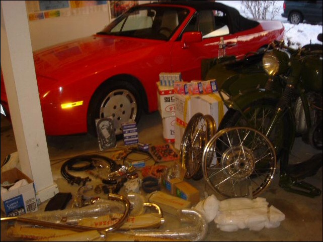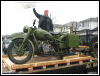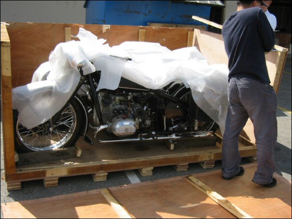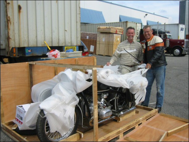 "Ahh! Finally, it's in the garage. I'm still waiting for two more [bikes] to arriveone OHV with a sidecar and one flathead. The boat should be here in three weeks." | ||||