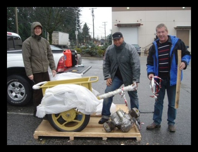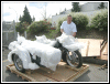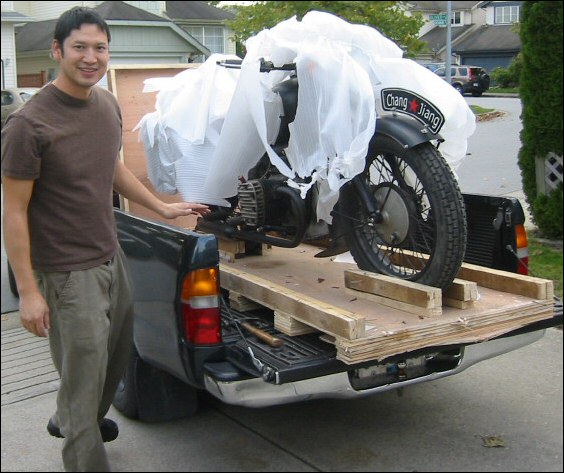 | "Rain! Gio picked up his CJS bike on a very wet day. After 15 minutes uncrating, adding gas & connecting the battery cable (in soaking rain) the bike fired on the second kick and ran flawlessly on the way home." | |||||