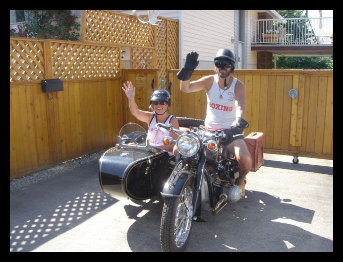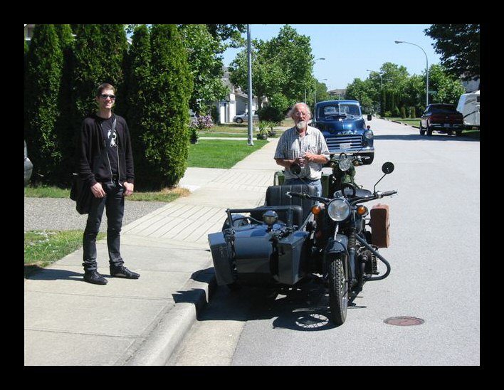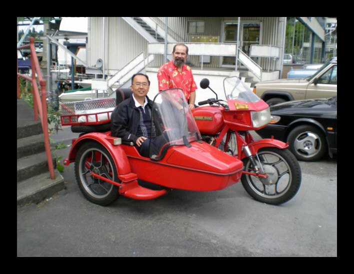 | This is Miin's friend Henk with John Wardley's new bike from CJS. Miin says this bike is probably the finest CJ he has ever seen. John is the owner of Okanagan Ride and Rest. | |||||