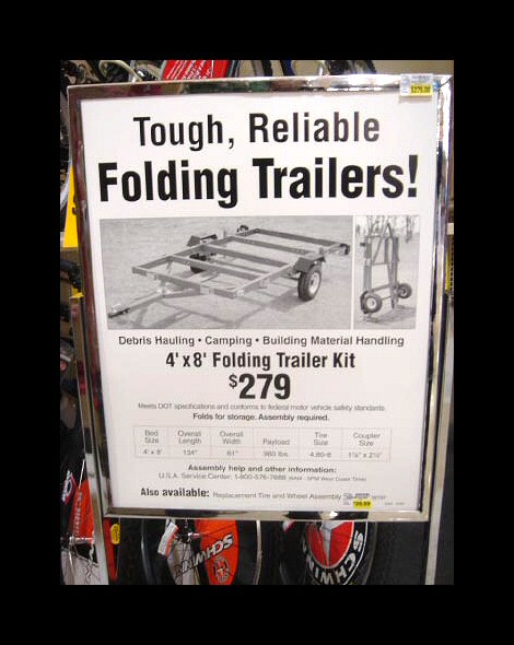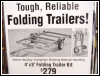 "A few of the local CJ riders bought this foldable trailer from Fred Meyers. Great for short distance towing. One guy did a 600 miles tow with no problems. They list for $279 and they go on sale almost every month for $199, or ask them to give you the last sale price like I did." | ||||