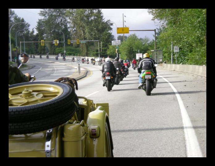 "The plan was to have a dozen CJs ride to the Vancouver Vintage Motorcycle Meet but only four diehards showed up in the rain. After 15 minutes the sky cleared up! A few CJ owners took their cars instead. Hope next year the weather is good so we can have more CJs come out." | |||