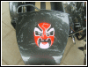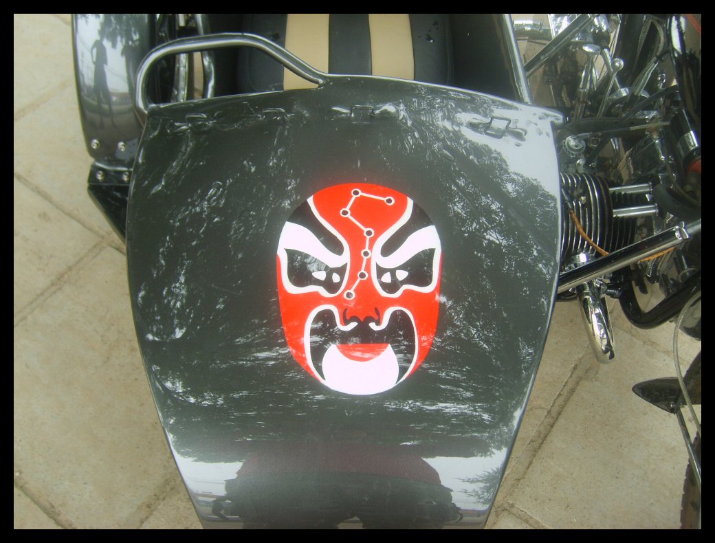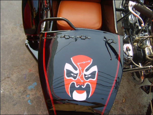 | "This bike I call Chinese Element because it has two kinds of Chinese national essencecalligraphy and Peking opera. Painted on the sidecar is a Peking opera style mask. On the tank you can find the Chinese calligraphy." | |||||