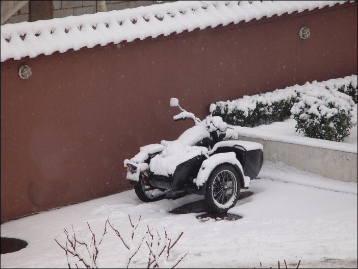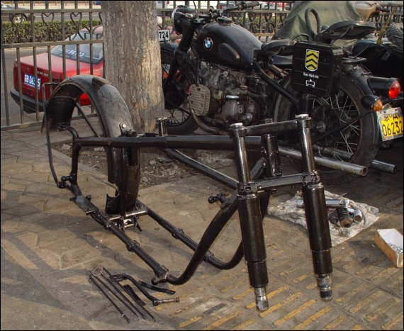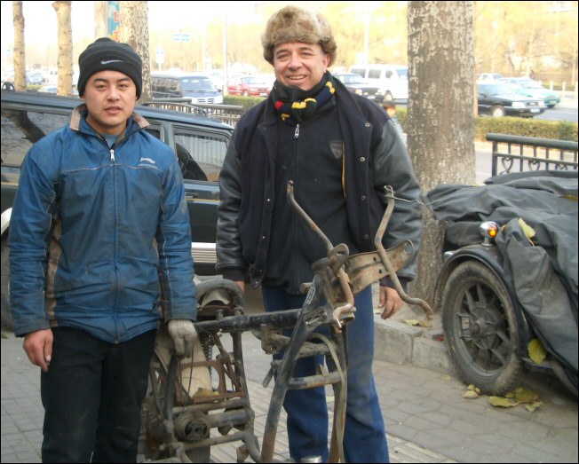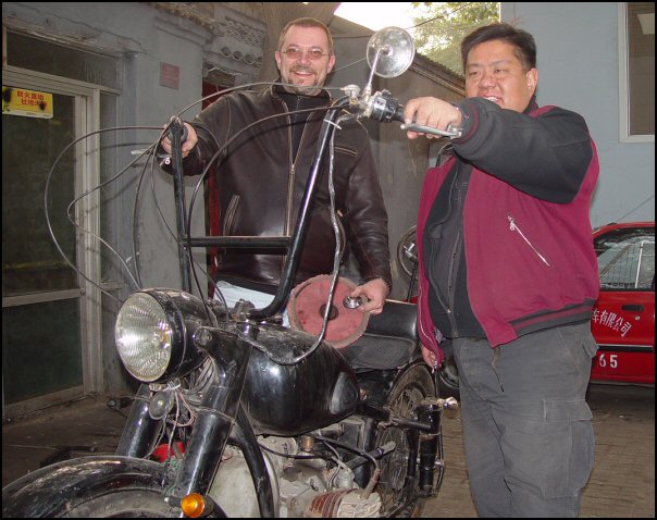 "Here are photos from my winter projectconverting a CJ to BMW power. They were taken at Zhang Zi's place. Mechanic & me with the BMW police bike we just stripped of its front end." | |||||