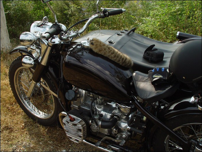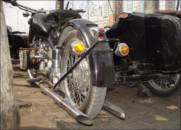 An M1M with a sidecar taillight mounted on the bike. These were actually used on the bikes until recently. Nice straight pipesand no rear seat pedestal. | |||||
