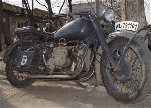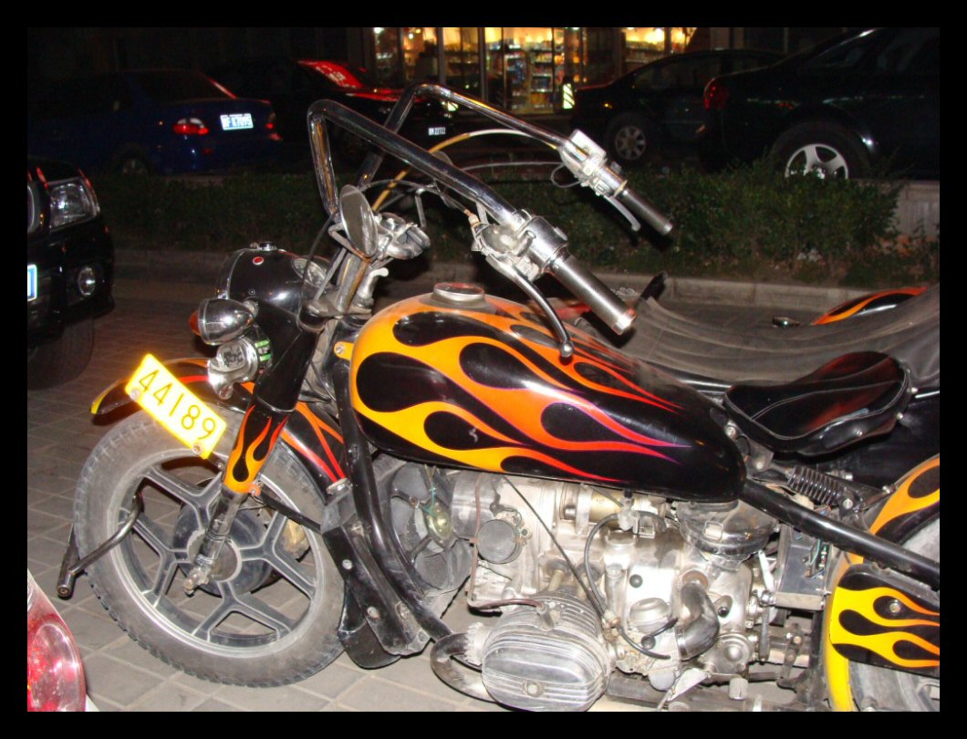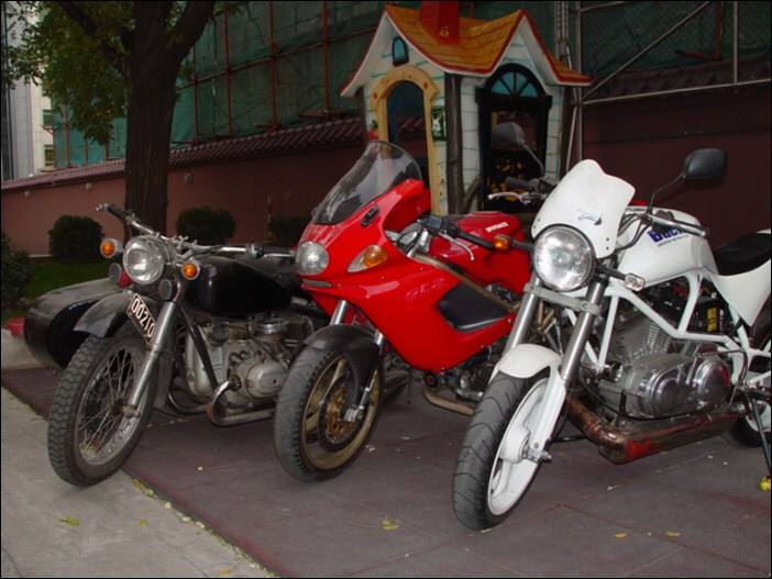 Solos aren't all that common in Beijing. This SV has a massive battery box mounted on the frame. It also has a rear fender bracket mounted on the front fender. Those are the world's shortest straight pipes too. | |||||