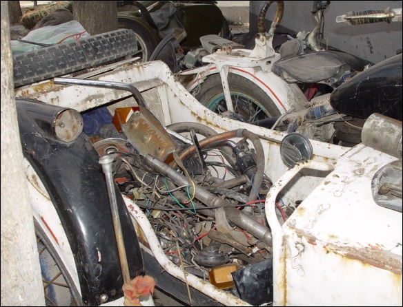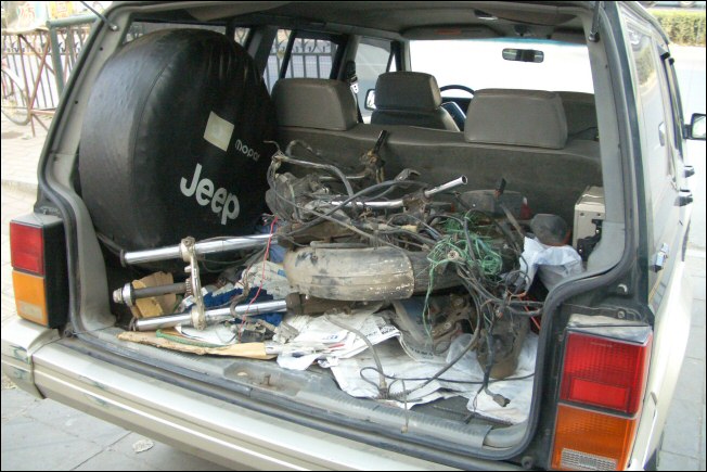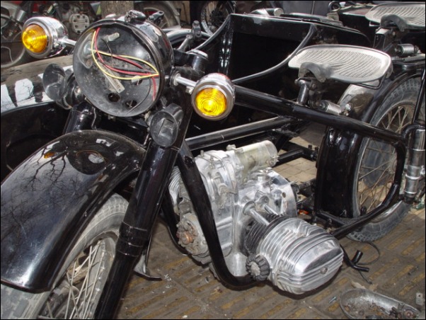 "The BMW front end in Guo Fei's Jeep. I got two 80 engines from Shao and one on eBay. I will be converting a Chang or two to Beemer power (with Beemer forks and disk brakes). Guo Fei has done a couple already and they are very high performance Changs. They use a Chang tranny and rear drive." | |||||