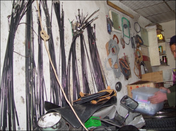Inside the shop (which doubles as the owner's living quarters) is this big collection of cables hanging on the wall. If ever there were spare parts I'd recommend everyone keep handy, cables would be it. | |||||