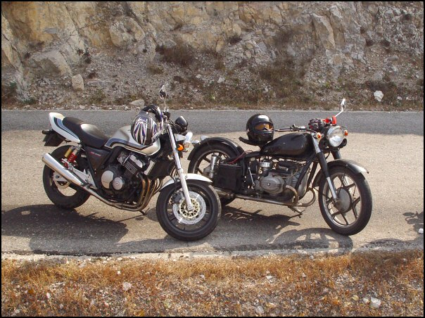 This shot was taken on the final group ride of 2004. One of the 18 bikes was this Japanese ride seen here next to Tim's OHV solo. | |||||