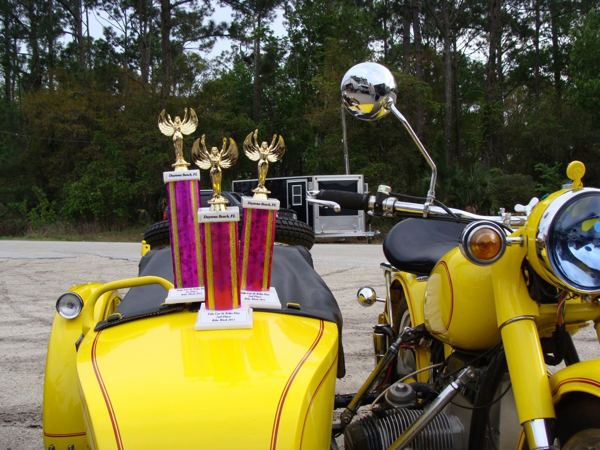 Tim sent loads of pics from Daytona Bike Week, but these two are of special interest. 1st, 2nd and 3rd place trophies at the trike and sidecar event were won by CJ Beemer conversions done by Jimbo. | ||||