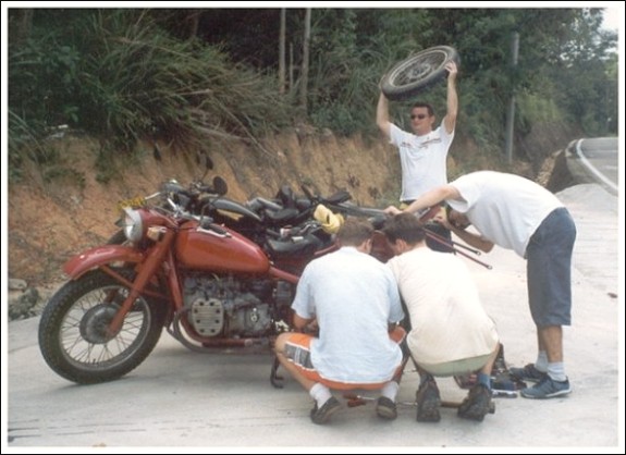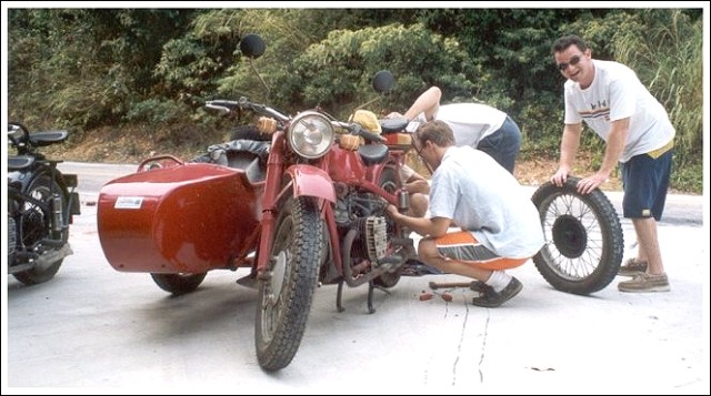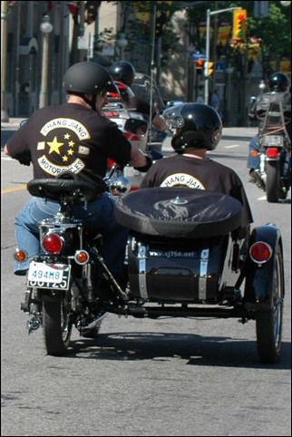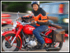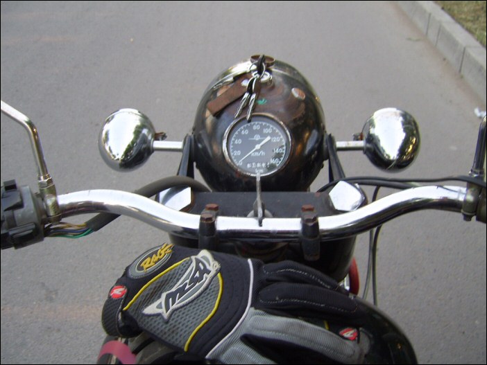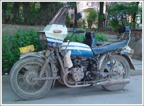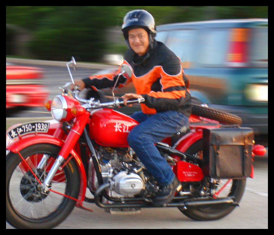 From Gary Morgan: "Returning to Ottawa, Ontario, Canada, summer 2006. Purchased in Beijing. Nicknamed Wild Cherry. (After the September 2005 group bike ride to Jiujiayi, Wild Cherry became aptly named the Cock Killer. After a direct hit from the sidecar bucket there is one less village rooster and further contribution to the bird flu pandemic." | ||||